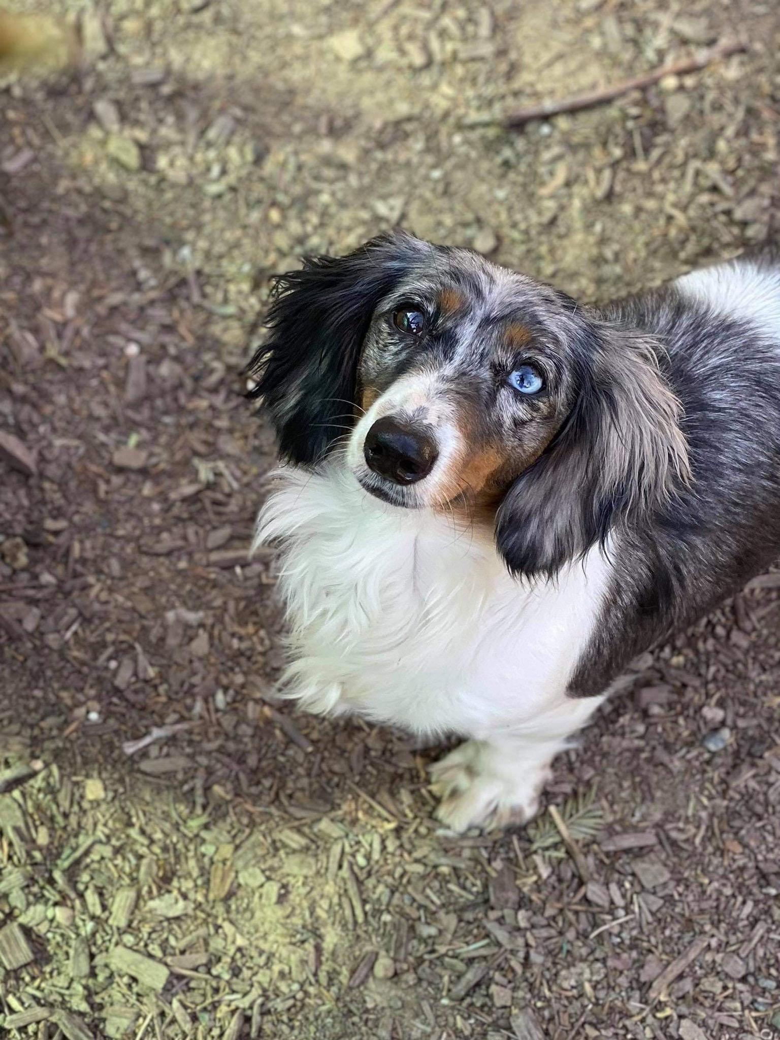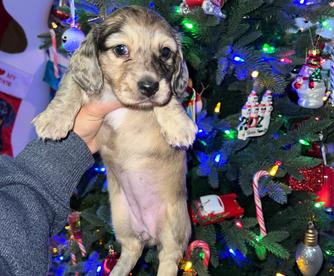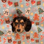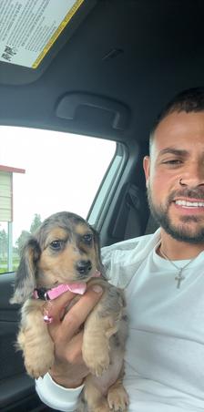 My husband has wanted a Dachshund since he was a kid and with his 50th birthday approaching it was the perfect time. I researched local breeders and fell in love with Monique’s dogs. The day came when we got to pick up Barney! I made sure to keep my distance so my husband could bond with him and that lasted about 24 hours…. I stole him. I started taking him to the office with me, and kept him with me when I worked at home… I bought a special dog seat for the car, a sling purse to carry him around in, a new bed for under the desk at the office, the list goes on. Barney is SPOILED ROTTEN. We all love and adore Barney, particularly our cat, Pokey. When Barney’s not working hard at the office him and Pokey are rough housing and chasing each other all over the house. Barney is also incredibly smart and learns commands fast! He already knew sit and has picked up new commands after only a few tries. He’s great with our other dog and our kids. We just adore him. Thank you, Monique! We will absolutely come to you for our next dachshund baby.