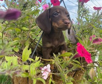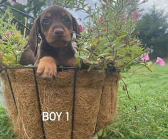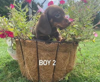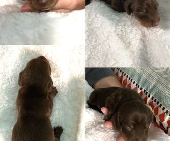 Along with her little boy helping I now have a sweet and beautiful chocolate doxie that loves children. That's a SUPER QUALITY of our little addition to our family!
