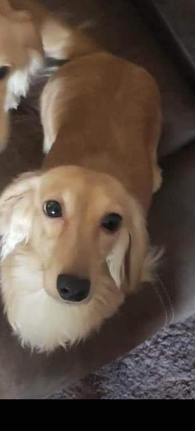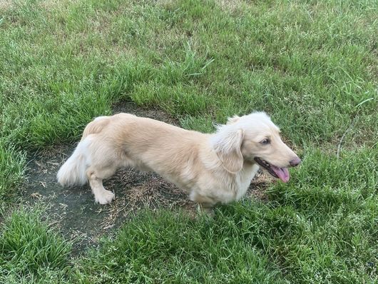 Trapper is a miniature AKC registered, health tested, longhaired cream dachshund.