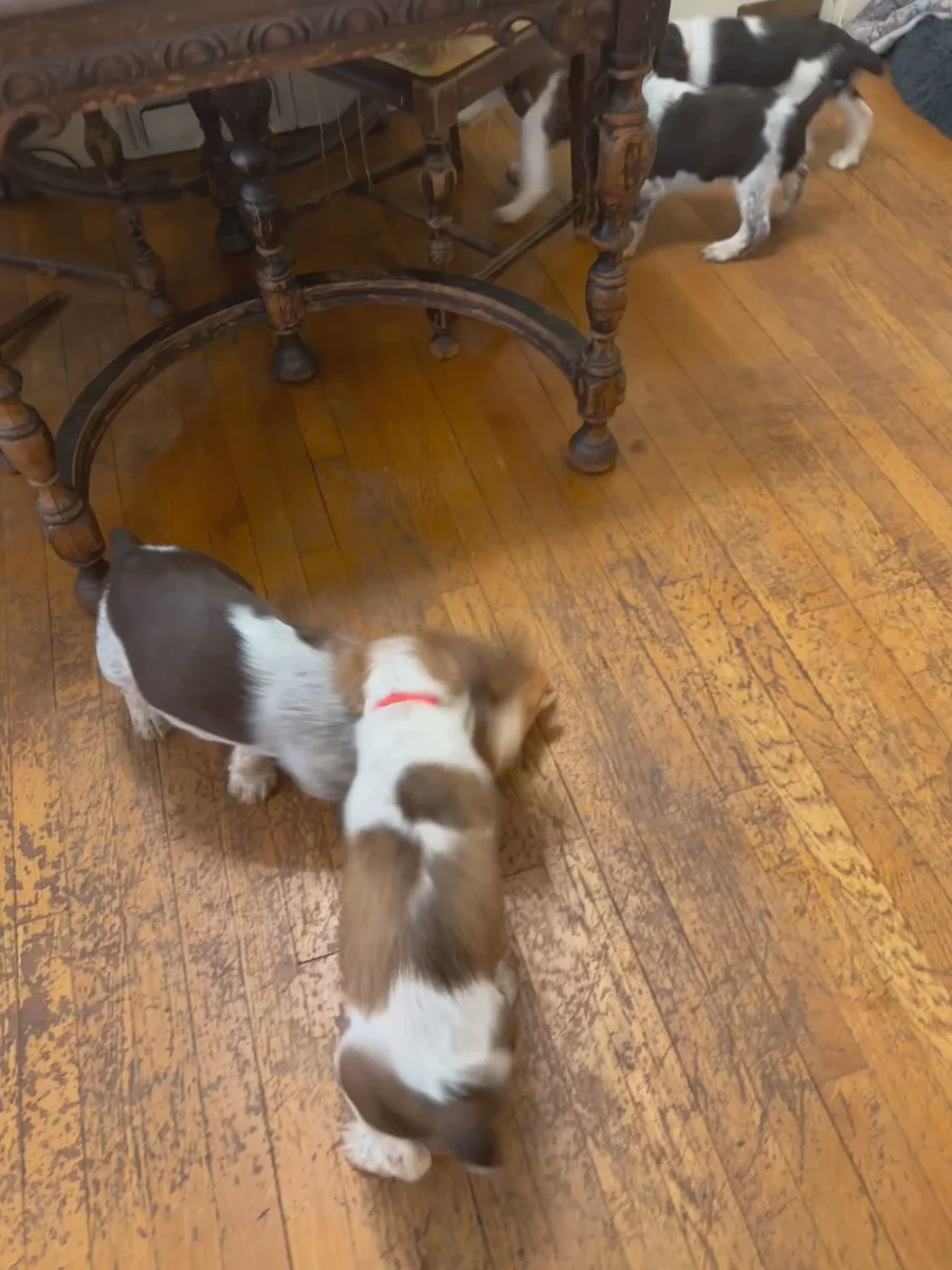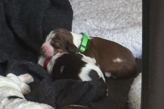 Our puppies include red and white, liver white and tan, and liver and white. Colors will vary depending on the parent dogs.