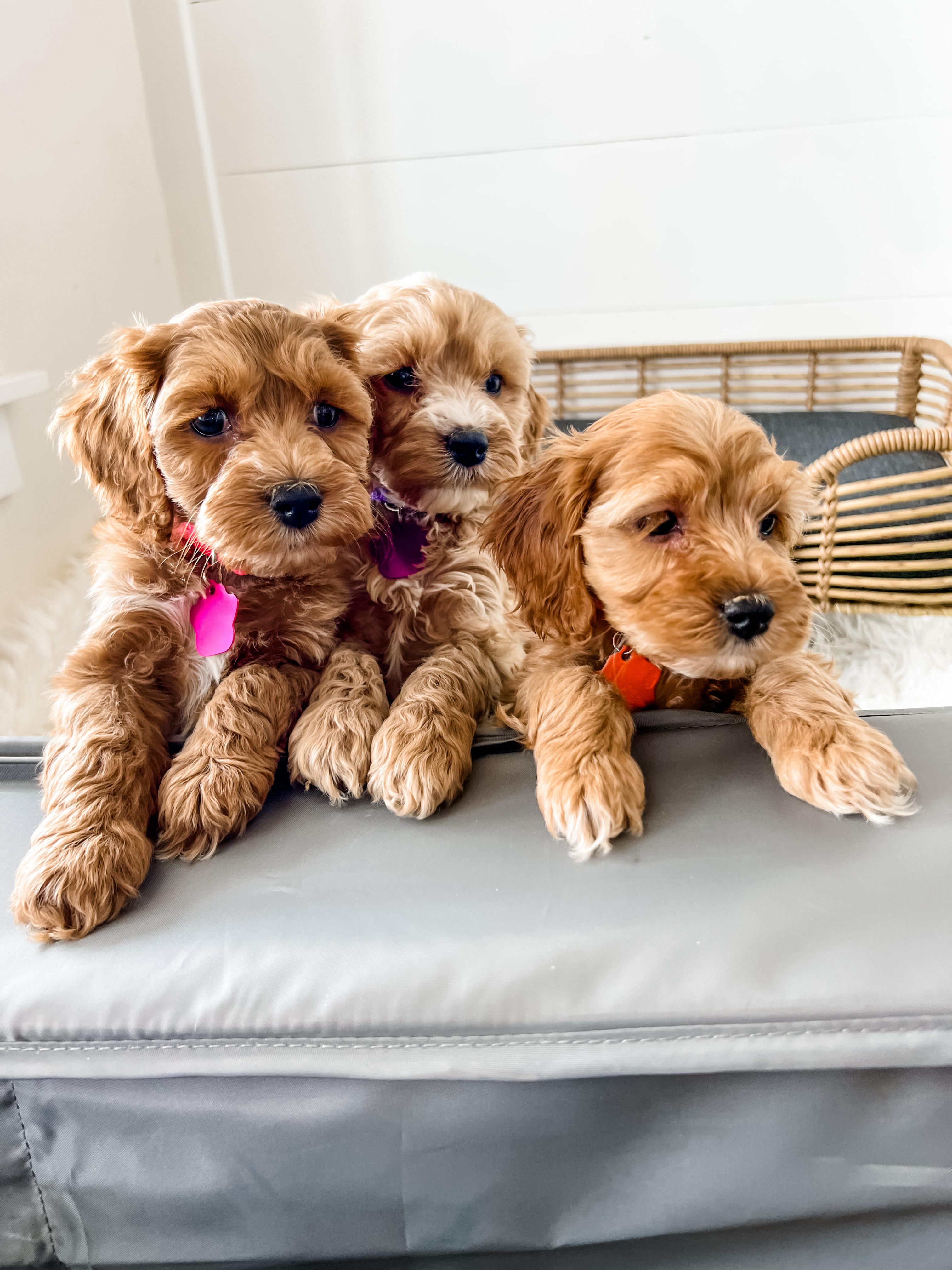 Our Cavapoo puppies include apricot, cream, and red. Goldendoodle puppies include cream, apricot, and red. Cockapoo puppies include cream and red. Colors will vary depending on the parent dogs.