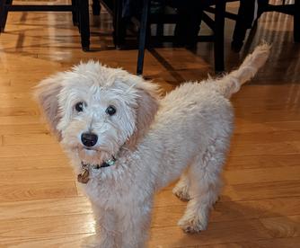 Angelica "Jelly" is a smart, friendly, confident girl who learns tricks quickly. She loves people of all ages, and she loves playing with her dog sister, Sofia. Jelly currently holds an AKC Advanced Canine Good Citizen certification. She is working on her AKC Fit Dog certification and is also working on her AKC Therapy Dog certification. Jelly volunteers with Pets on Wheels as a therapy dog and visits residents at a local assisted living facility once or twice a month. She weighs about 15 pounds and has a thick, wavy and curly reddish-brown coat with a white patch on her chest.