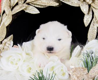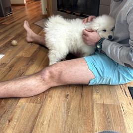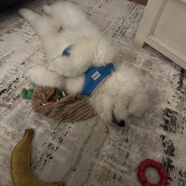 I had a wonderful experience with Rocky Mountain Samoyeds! From the very beginning, they were professional, knowledgeable, and genuinely passionate about their dogs. They took the time to answer all my questions, provide detailed health records, and ensure that Maximus' now Koda was well-socialized and loved. He looks like a little polar bear, so Koda Bear 🐻 just made sense! Koda has the best temperament: affectionate, playful, and incredibly well-adjusted. It seems from Koda that they put a lot of care into their breeding program, prioritizing health and temperament. Additionally, we used their flight Nanny, who was very professional. I was nervous, but he put me at ease with text updates all through their journey to WI. It’s day 3, and we are more in love with this little guy!! Potty training is going as expected, and the snuggle puppy was a good purchase.