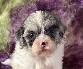 Doolin is a gorgeous chocolate Merle blue eyed toy poodle. He is new to our program as we retired Coco.