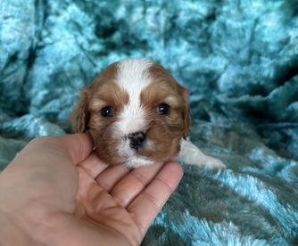 Cavapoo puppies include merle, black and white, blenheim, and red. Cavalier King Charles Spaniel puppies include blenheim and ruby. Colors will vary depending on the parent dogs.
