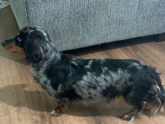 Betsy is a long hair black/tan dapple mini dachshund. She is CKC registered. Betsy is carefully selected for her health and temperament.