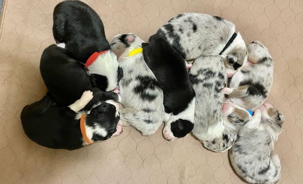 Our puppies include black, blue merle, and red. Colors will vary depending on the parent dogs.