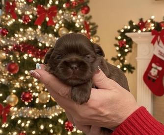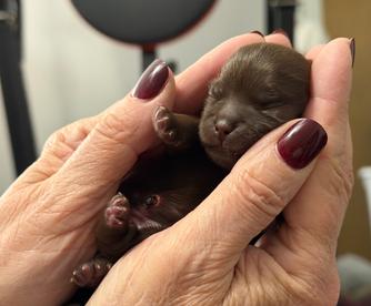 Winston Churchill, AKA Church, is a solid chocolate boy with liver undertones. He is short-legged and stocky, and his coat is laced with silver. Church has been checked by a veterinarian and is healthy and disease-free. He is three years old and loves to give kisses and snuggle under the covers. Church is a daddy's boy and has to go everywhere Dad goes. He loves car rides. His funny antics keep us laughing. He generally throws all chocolate and chocloate & white puppies. All puppies are liver nosed. Church is also available for stud services!