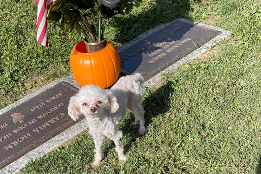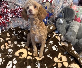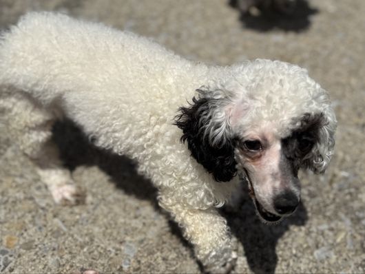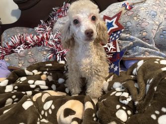 Maybelline is a white poodle with black and gray markings would be considered as a party. She is 9 inches tall. She’s a very delightful young lady she loves playing.