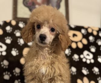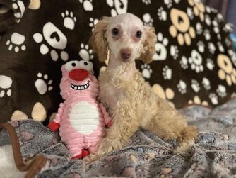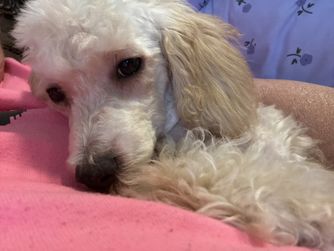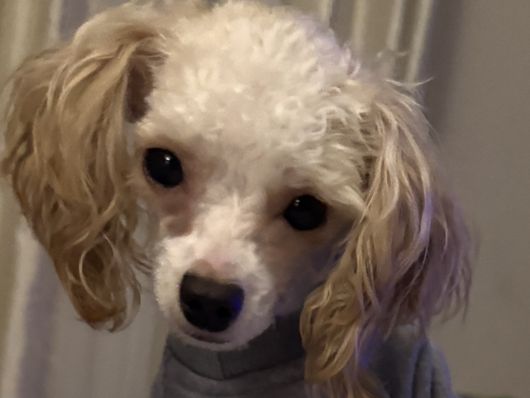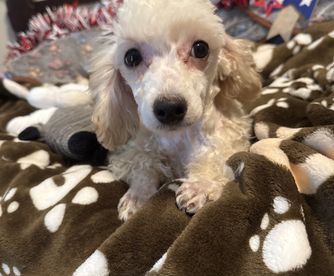 Zumba is is a small Toy Poodle who is white with apricot ears he is 4 1/2 pounds and sweet as can be