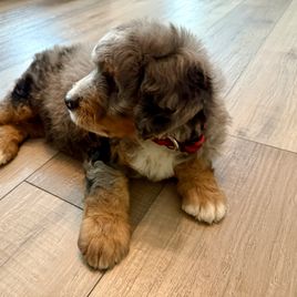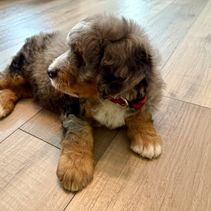 Our Goldendoodle puppies include apricot, red, and parti. Bernedoodle puppies include tri-color, phantom, and merle. Colors will vary depending on the parent dogs.