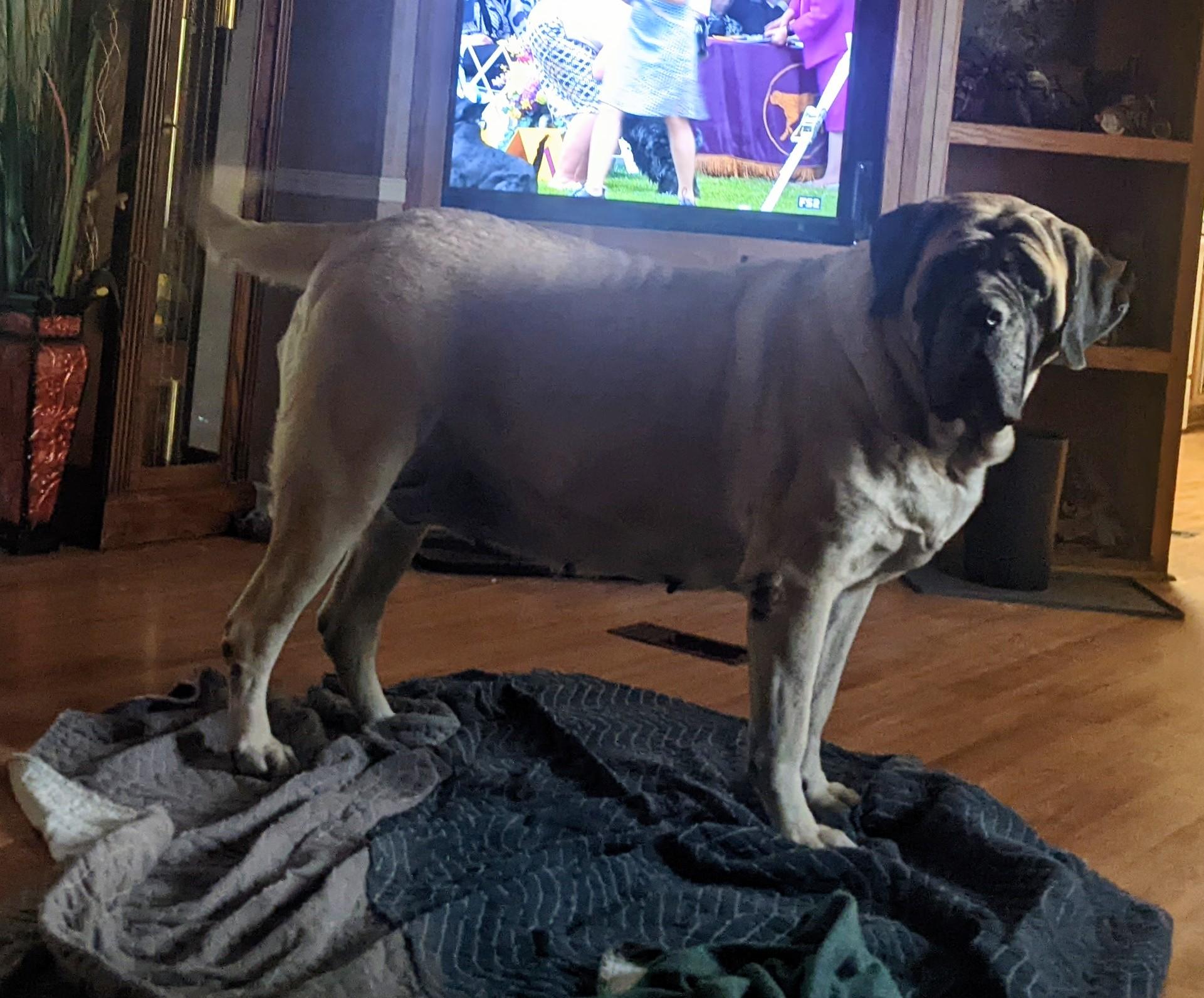 Beautiful, 30" at withers 200 lb girl. First litter put her in HOF and she received the most championed offspring award! She moves beautifully. Buttercup has her CGC and is the sweetest girl. She loves playing with toys and is the Queen of our home!