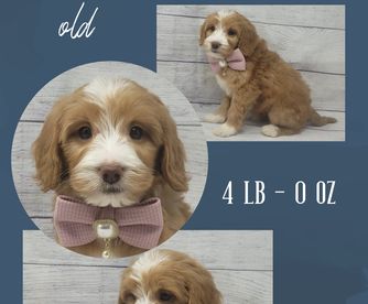 Our Cavapoo puppies include red, blenheim, and apricot. Goldendoodle puppies include apricot, red, black, merle, and parti. Colors will vary depending on the parent dogs.