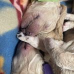 This has been a busy week for the island puppies! They all have opened their eyes and started walking (albeit pretty wobbly but they’re all making good progress). They got their very first puppy trims (faces, feet, and tail bands trimmed), and they’ve had visitors almost every day!