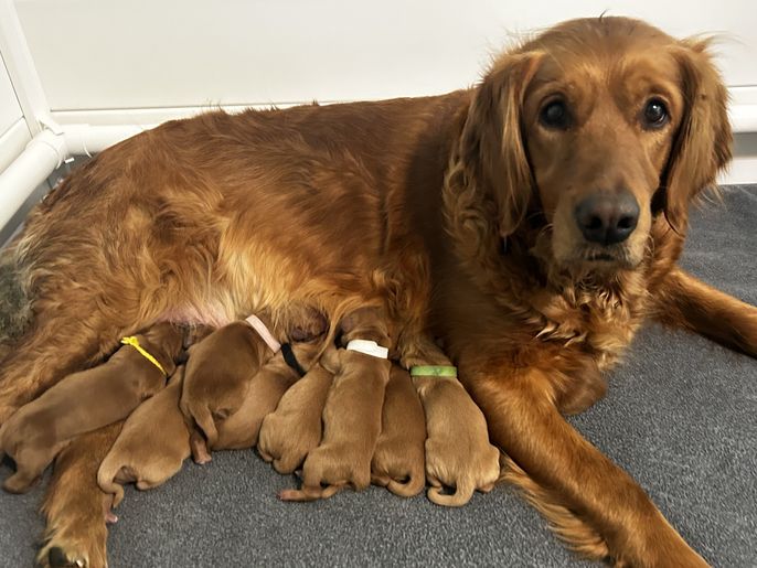 We have three generations (and growing!) of golden retrievers, grandma, momma and daughter in our breeding program now. Grandma (nearly 10yrs old) and momma (Toffee) lives with me and my family, and Kasha (daughter) lives with one of my dearest friends and her family (3 kids!)