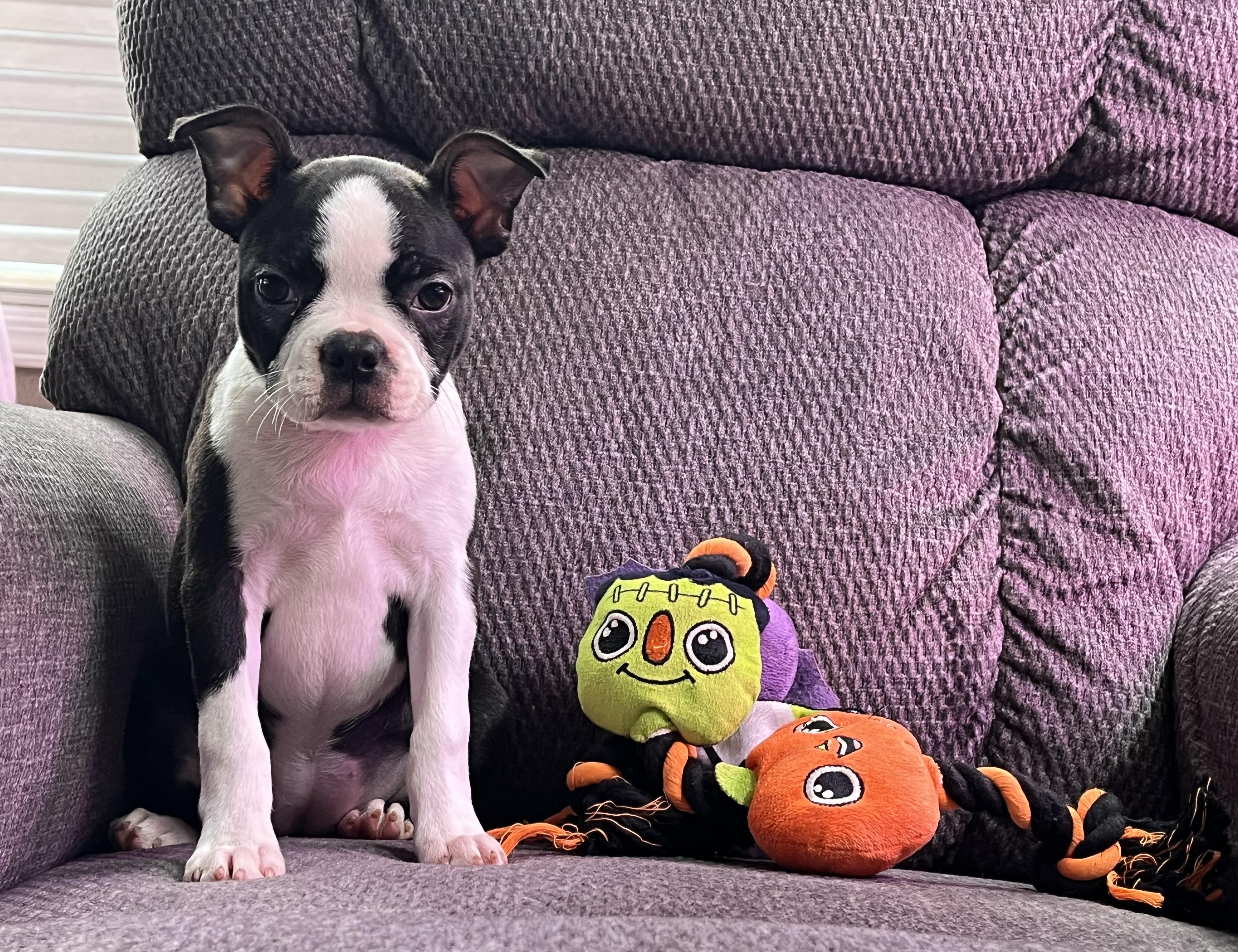Nicole is a responsive communicator and obviously an experienced breeder. We received a lively healthy microchipped puppy with all his health and registration. records. Nicole is a careful and responsible breeder of Boston Terriers. We had a choice of puppies from two litters at the time. Mister (Gator) had an uneventful flight home in our daughter in law Cassey’s arms. Needless to say he has become our happy little Granddog.