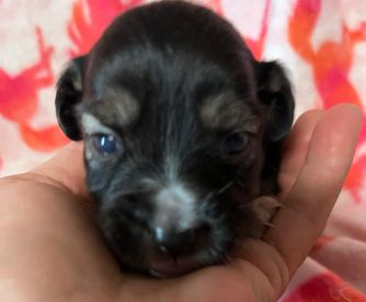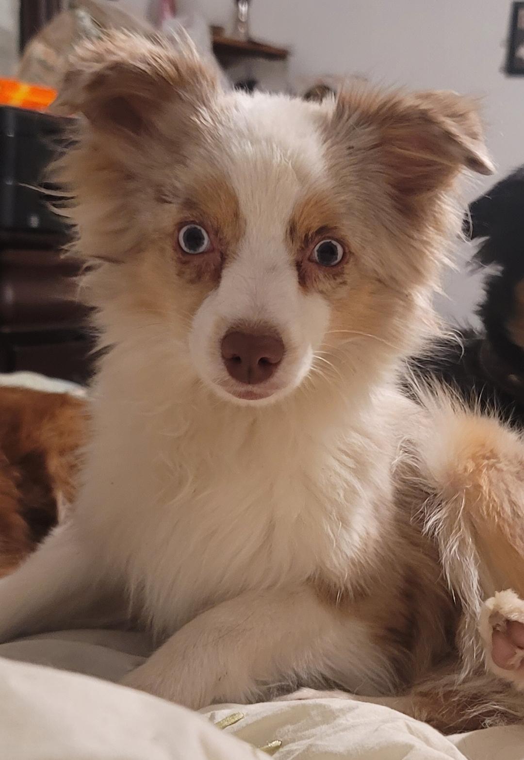 Moose is a large toy small mini red tri male. He has 1 blue eyes. 14.25"