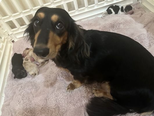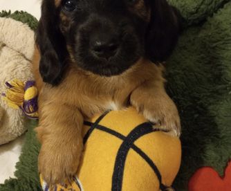 Puppies are doing great and had their vet exams today with flying healthy results. Puppies will start going to their new homes this weekend. Puppies are healthy, low temperaments like their parents, beautiful companions, well socialized, short legged, floppy ears and beautiful dispositions. Puppies come dewormed, upd on shots, microchipped and potty trained. One puppy left, beautiful long haired blk/tan.