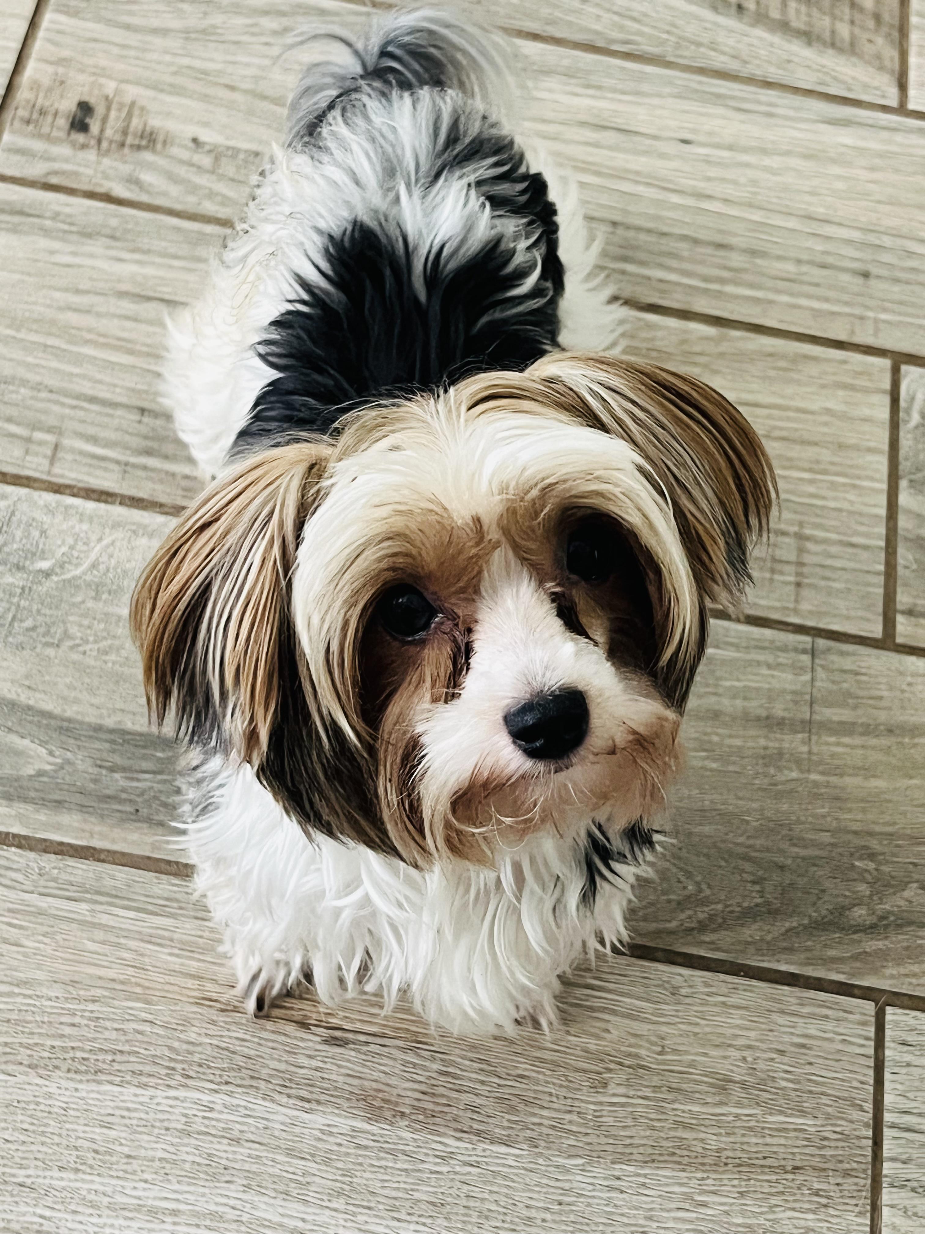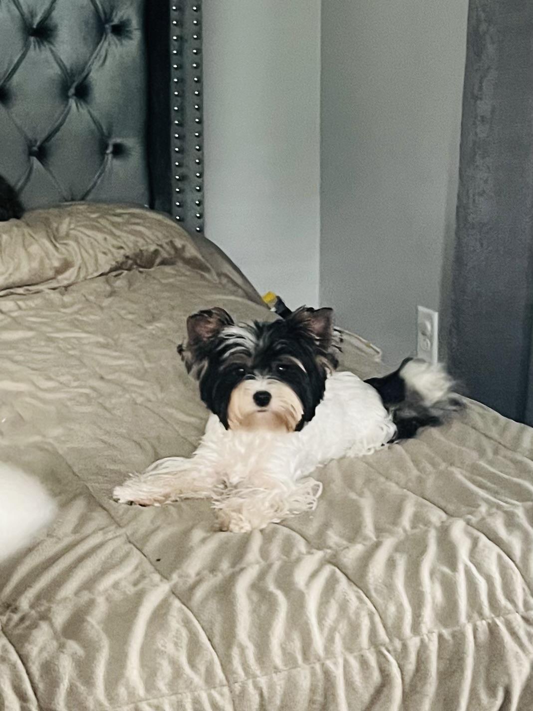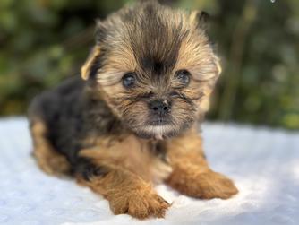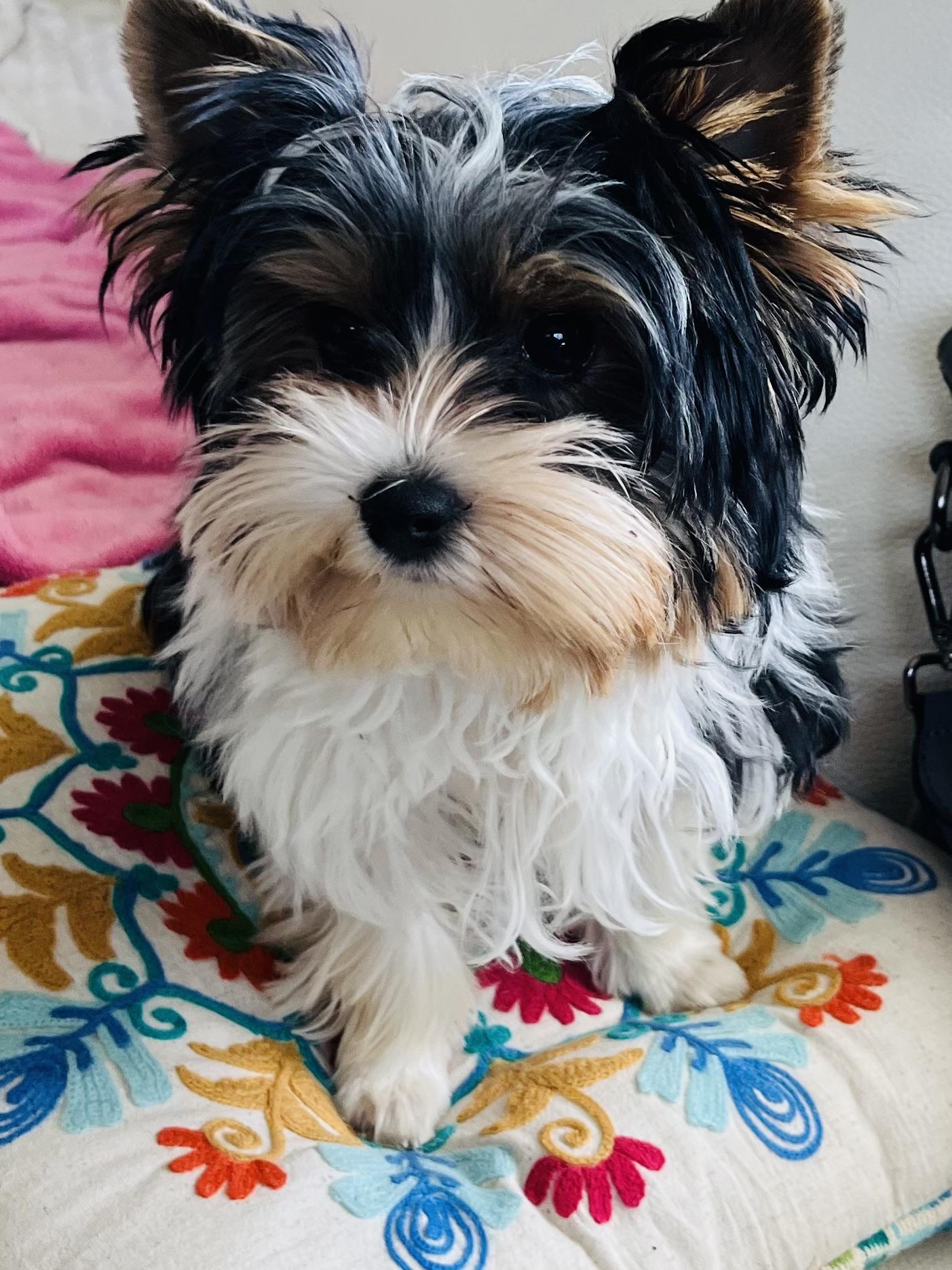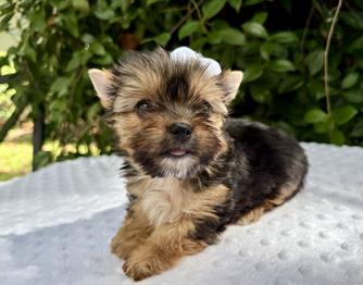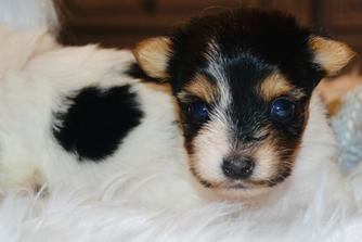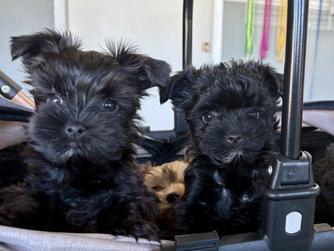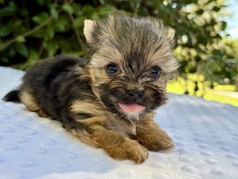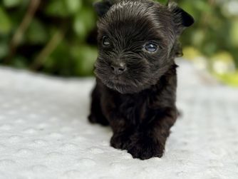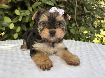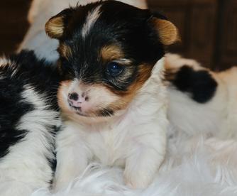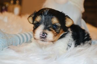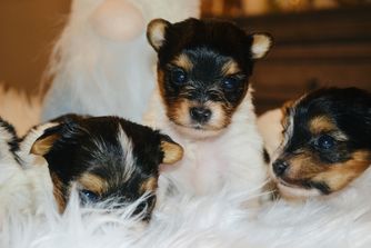 Our Australian Shepherd puppies include blue merle and black tri-color. Biewer Terrier puppies are black tan and white. Yorkshire Terrier puppies are black and gold. Colors will vary depending on the parent dogs.