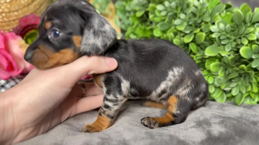 Tabitha is out of Akc and UKC show lines. Her sire is a AKC Grand Champion. Dam is a UKC champion. Tabitha is a black and tan dapple Carrie’s chocolate and pied.