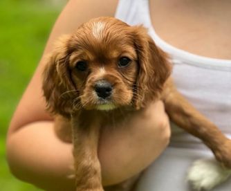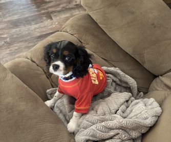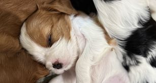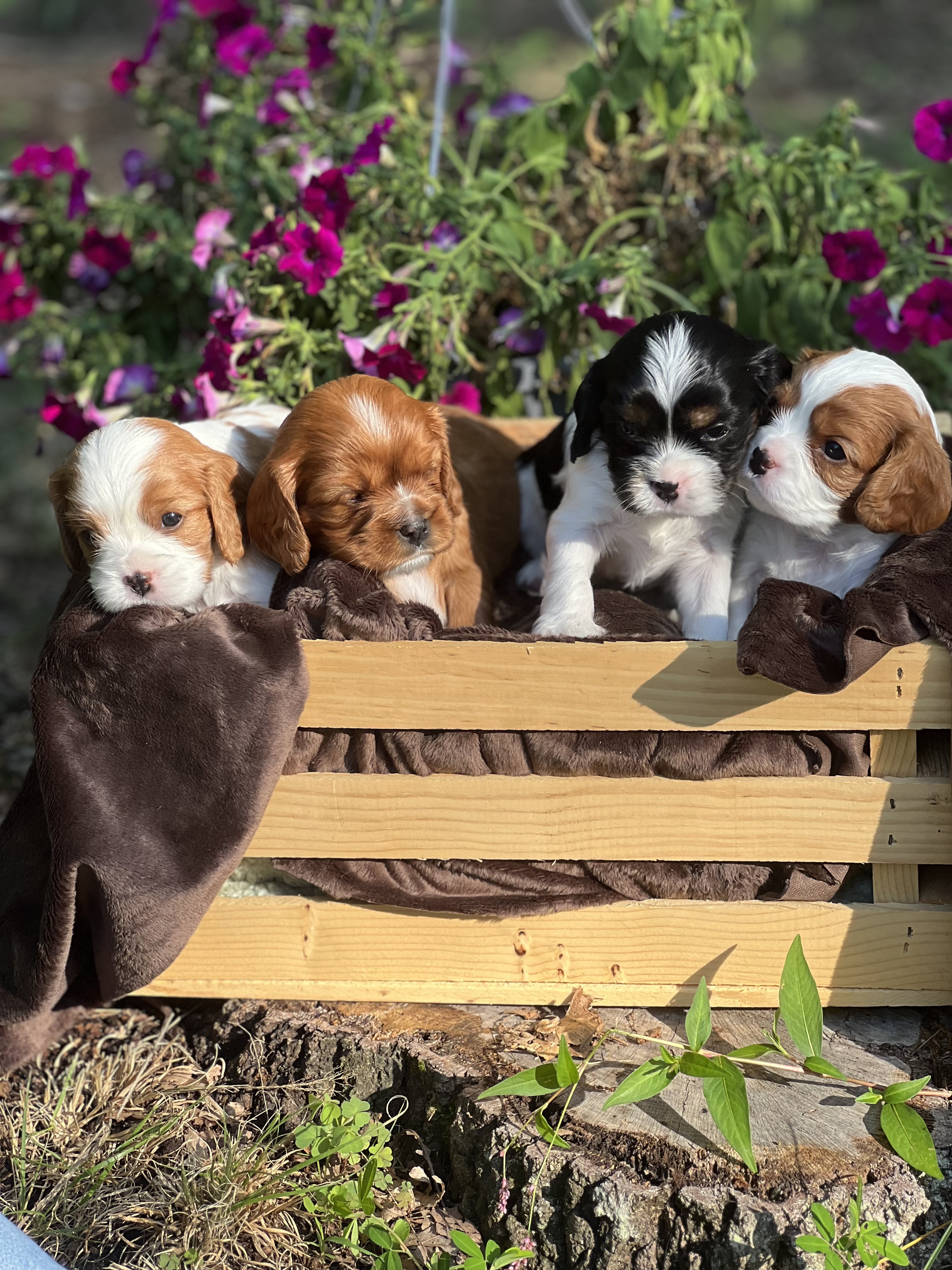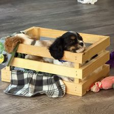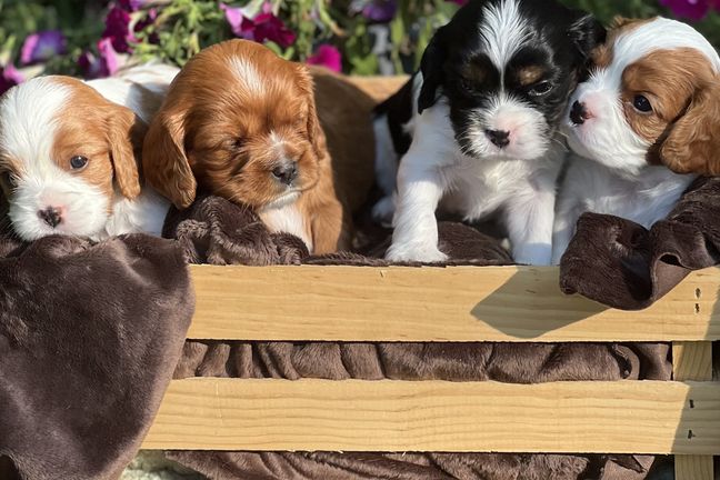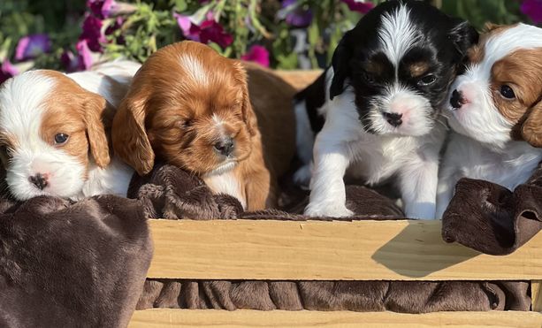 Our puppies include blenheim, ruby, tri-color, black and tan, and chocolate. Colors will vary depending on the parent dogs.