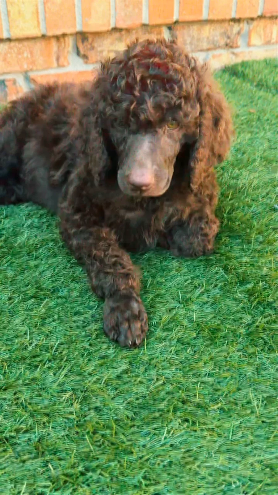 🌙 Copper Moon — Our Water-Loving Southern Gentleman 45 weeks old • Chocolate Standard Poodle • 70 lbs Meet Copper Moon, our breathtaking chocolate Standard Poodle with a presence that turns heads and a personality that wins hearts. At just 45 weeks old and already 70 pounds, he’s leggy, athletic, and built like the perfect Southern athlete — deep chest, tight curls, strong bone, and that unmistakable Royal Dixie headpiece. And let’s be honest… this boy is water obsessed. You cannot keep him out of the pool, and the hot tub may as well have his name on it. If there’s water — he’s in it. If there’s splashing — he’s the reason. Whether he’s launching himself joyfully into the pool, pacing the edges like he’s guarding his kingdom, or easing into the hot tub like he’s living his best life, Copper Moon is our proud, soaking-wet, sunshine-smiling, water-loving goofball. But indoors? He softens immediately. Copper Moon becomes all heart — gently placing his head on your knee, leaning in for affection, and looking at you with eyes that say you’re his whole universe. Loyal, steady, people-focused, and deeply intuitive, he carries the temperament families dream of and breeders spend years working toward. He is projected to finish 75–85 pounds, all muscle, grace, charisma, and charm. OFA/CHIC testing begins in 2026 once he reaches full maturity, and we expect him to pass with the same confidence he shows in everything he does. A magnificent coat, a heart of gold, a water-loving spirit, and that classic Mississippi charm — Copper Moon is everything a Standard Poodle should be, and then some.