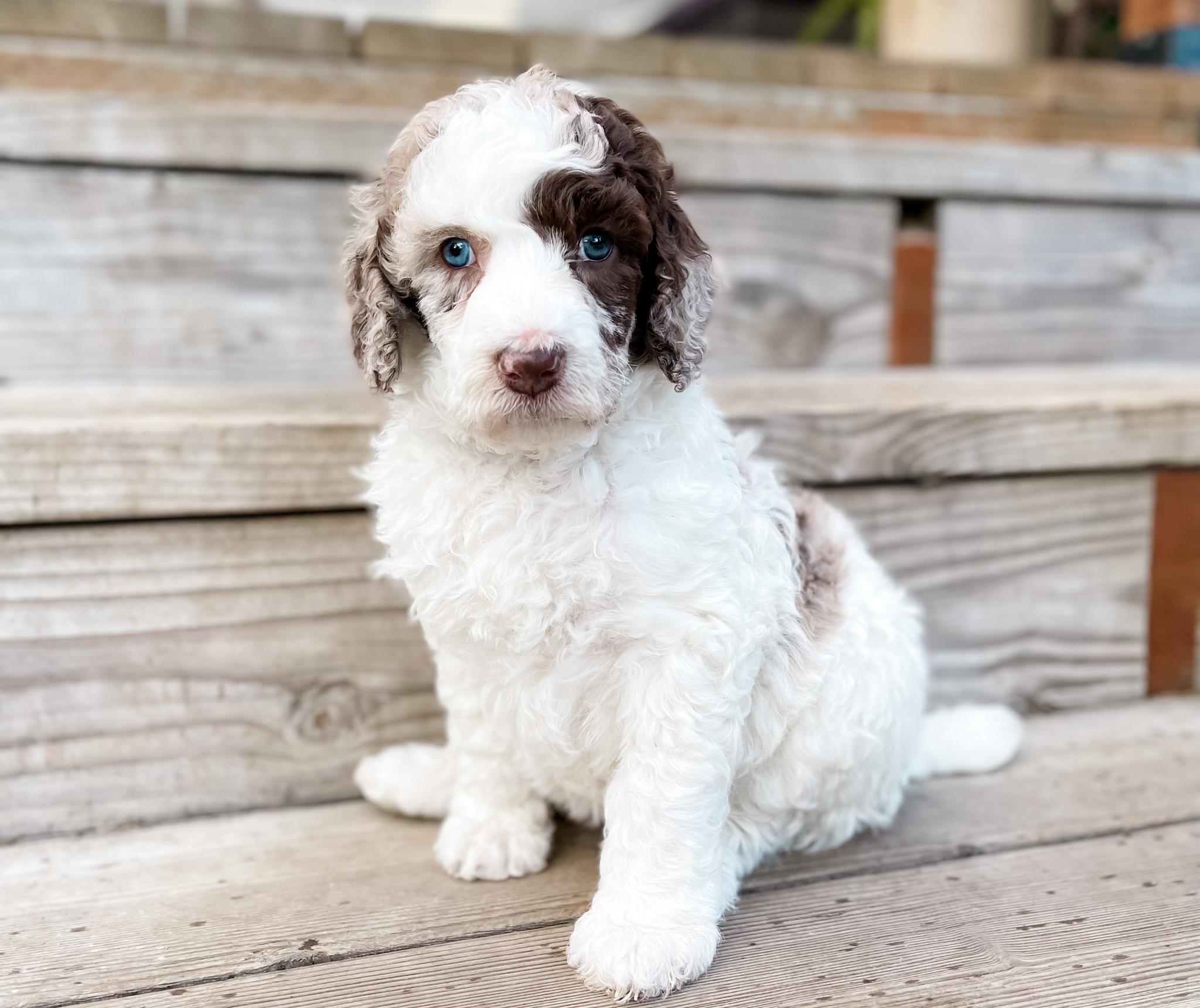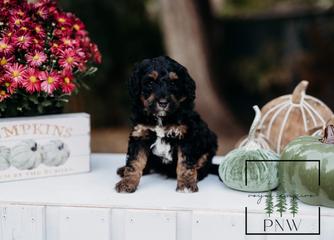 Our Cockapoo puppies include merle, brown white and tan, and black and tan. Bernedoodle puppies include brown, black and white, phantom, and blue merle. Colors will vary depending on the parent dogs.
