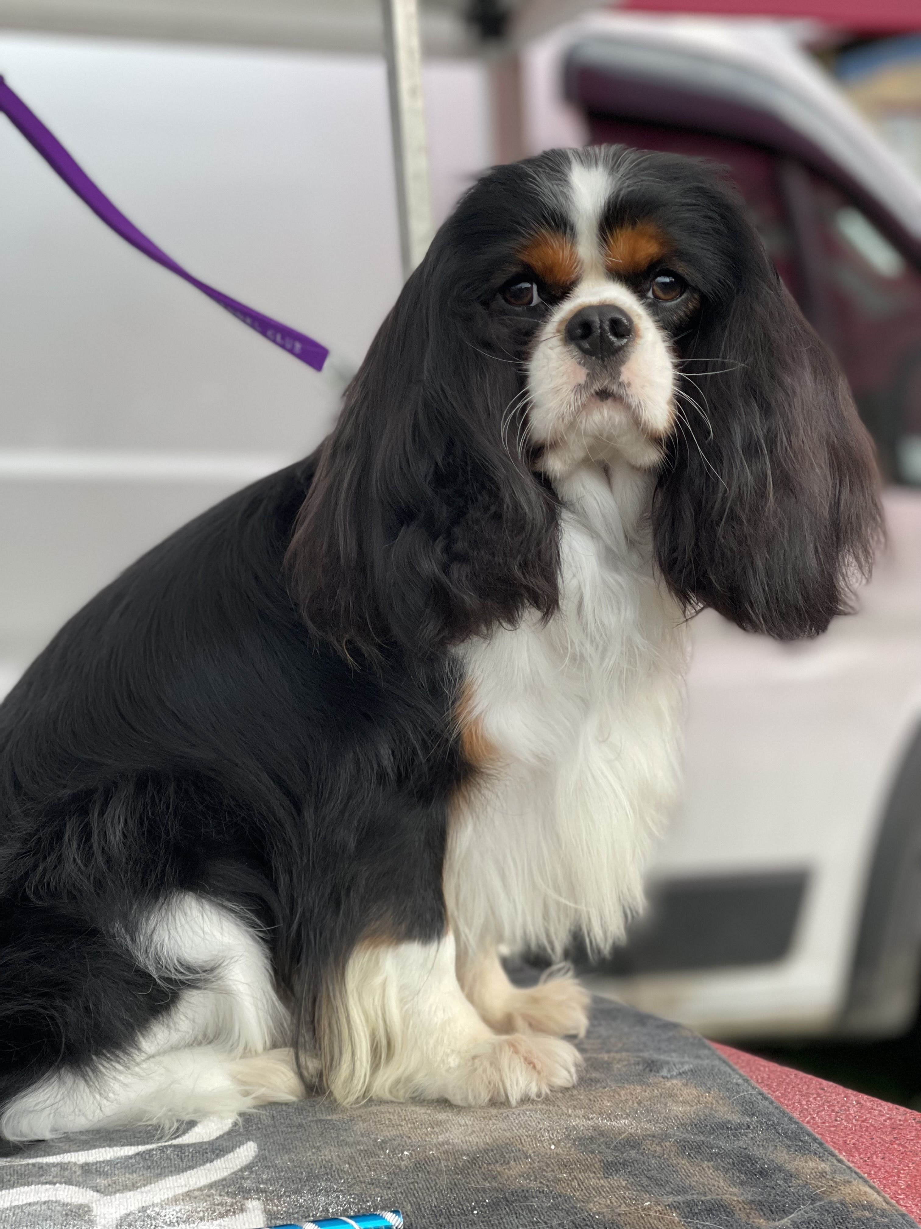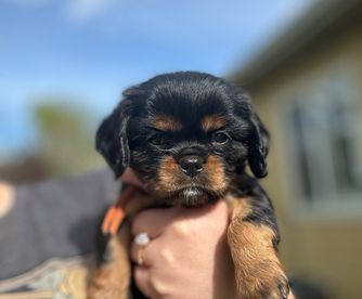 Clover is our beautiful, versatile black and tan girl. She has an ideal cavalier temperament and lovely conformation. She’s a beloved pet and show dog.