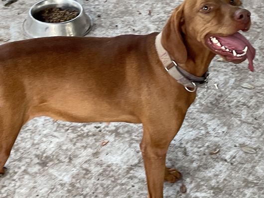 Rica is a super loving girl that has some show lines in her lineage. We acquired her from Red Jacket Vizslas. She is very Velcro and cannot get enough loving. She is a great mom and is affectionate to everyone.