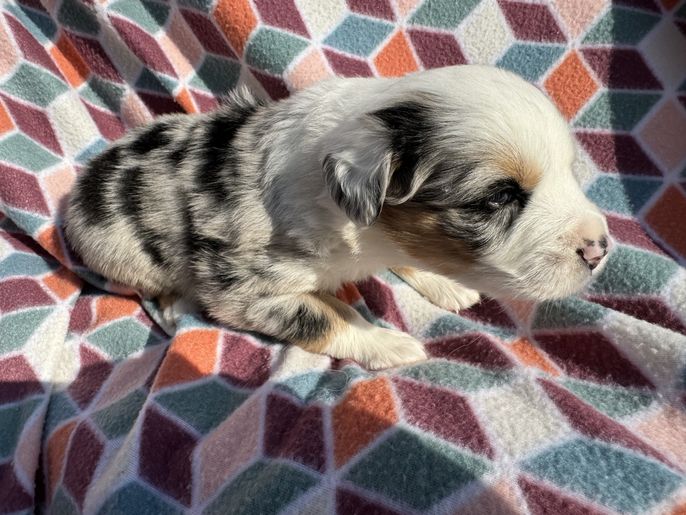 Our puppies include blue merle, black tri, red tri, and red merle. Colors will vary depending on the parent dogs.