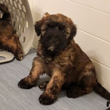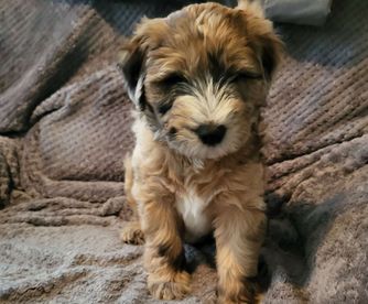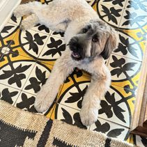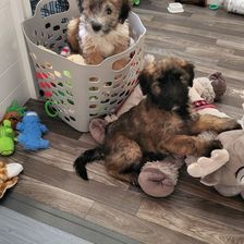 Rex is a Merle Whoodle whose dad was a 14 lb Moyen Poodle. He is 50/50 Wheaten Terrier and Poodle. He's a sweet, affectionate, very intelligent, and fun little boy. He's 35 lbs. He loves ice, mice (toy cat mice) , playing fetch, giving and getting cuddles all day and every day. He is a very loving boy and great with his babies too. Has been playing with them since they were able to walk.