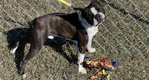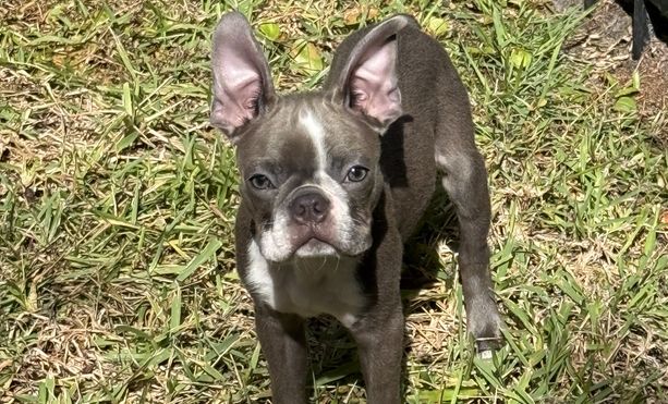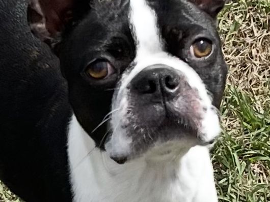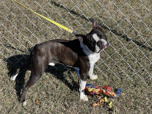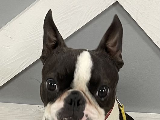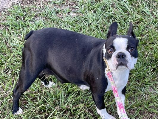 Maya is a beautiful old school stocky build with a black coat and brilliant white that really shows that boston terrier look we all love . She is confident and friendly and greets everyone like an old best friend . She plays with others well and is not a barker . She truly is a great all around dog.