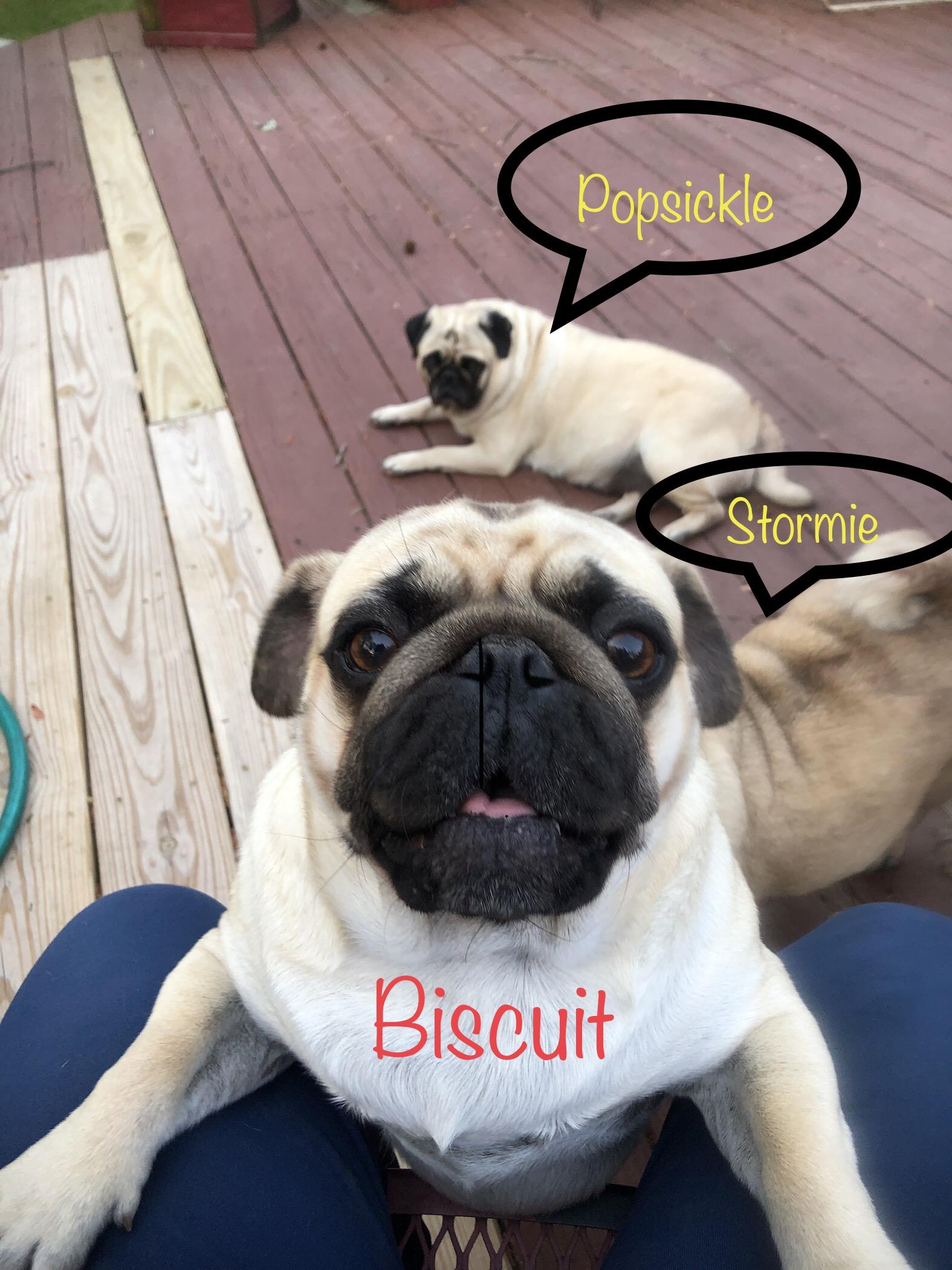 Biscuit is very light in color, her ears are dark but a bit chocolate mixed in, she is Stormie’s daughter, the only puppy I’ve ever kept from any litters, she is the sweetest pug!!