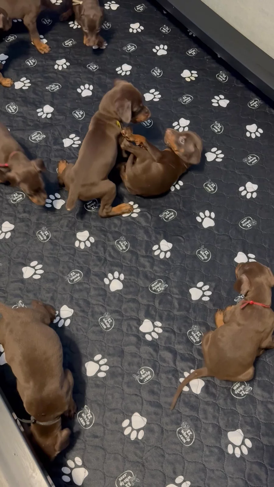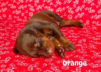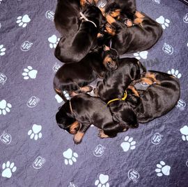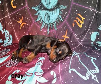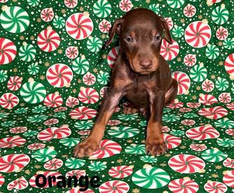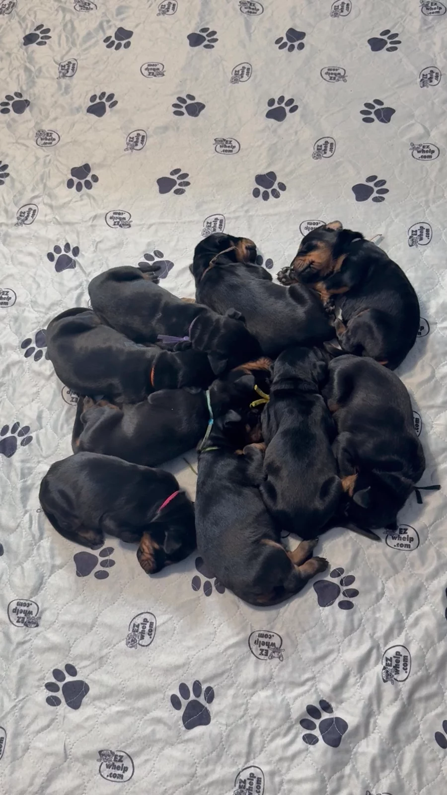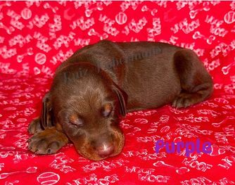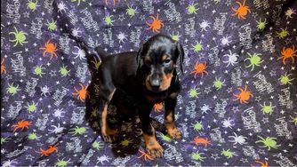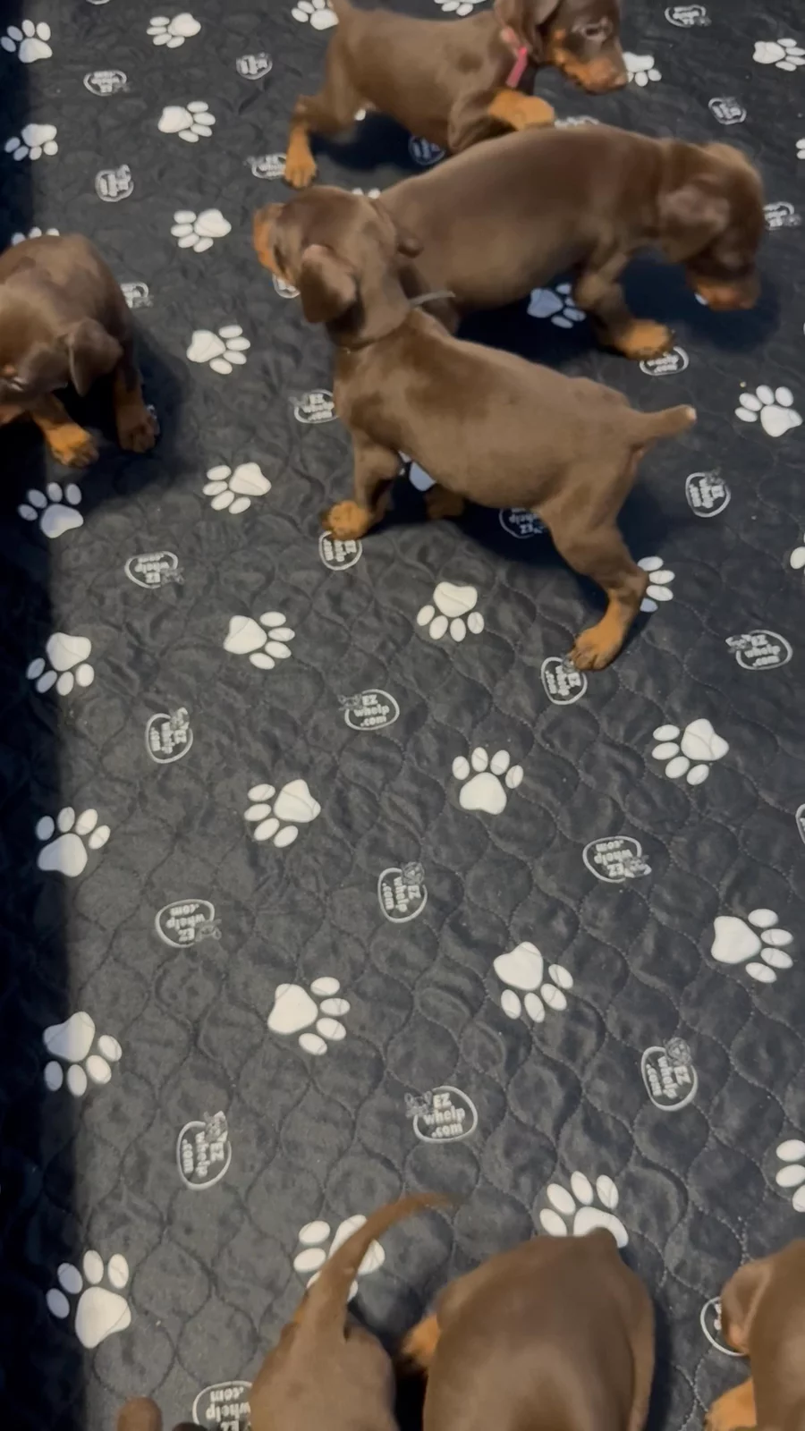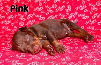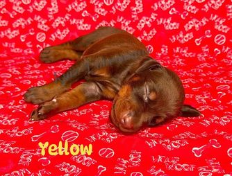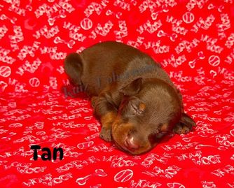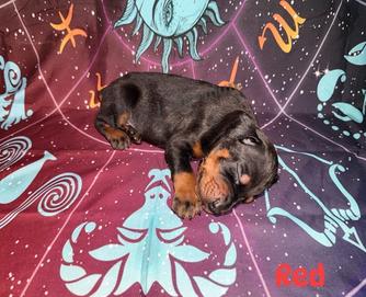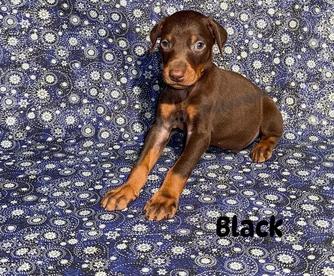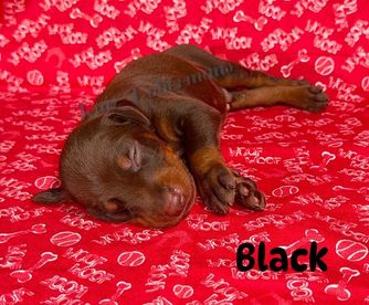 Our puppies include black and rust, blue and rust, fawn (isabella) and rust, and red and rust. Colors will vary depending on the parent dogs.