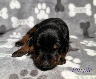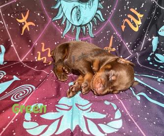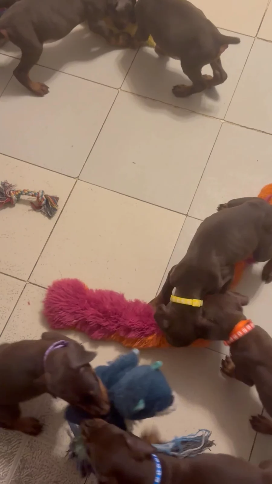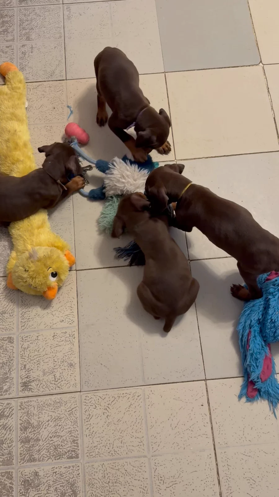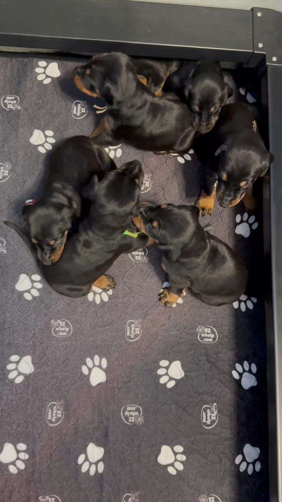 Our puppies include black and rust, blue and rust, fawn (isabella) and rust, and red and rust. Colors will vary depending on the parent dogs.