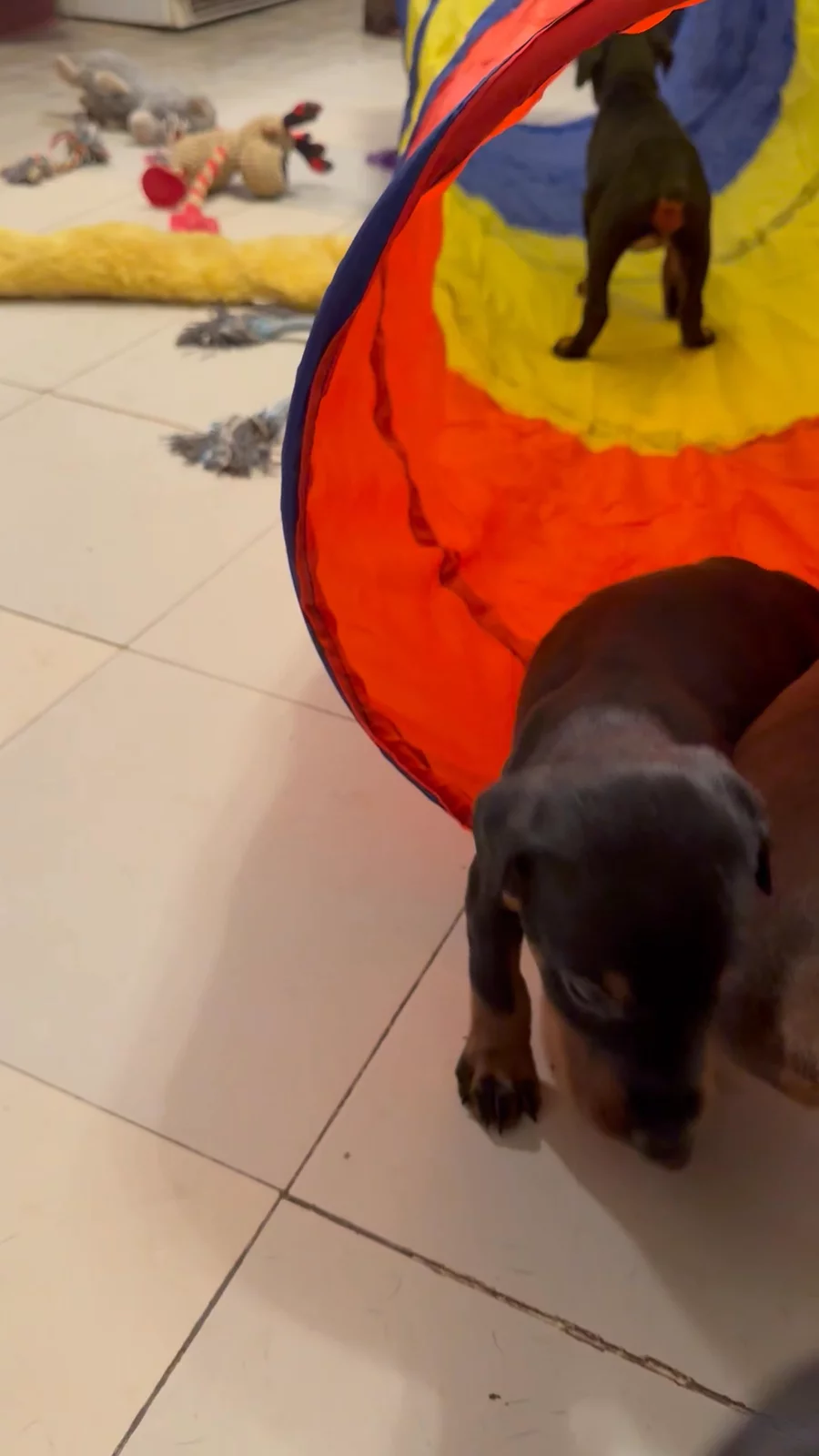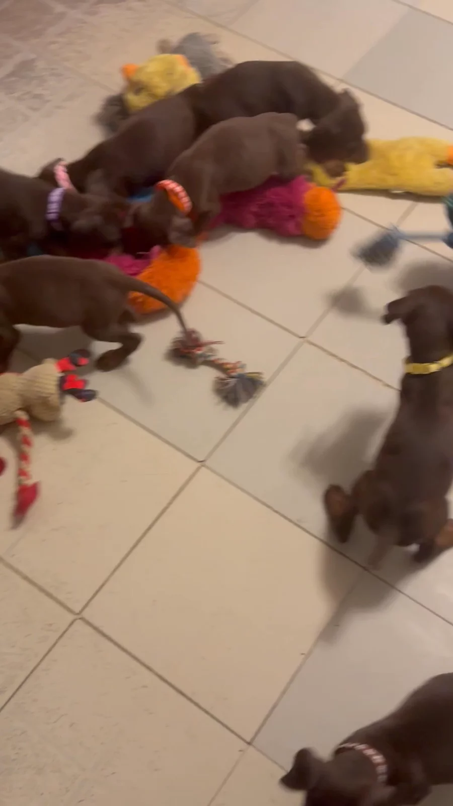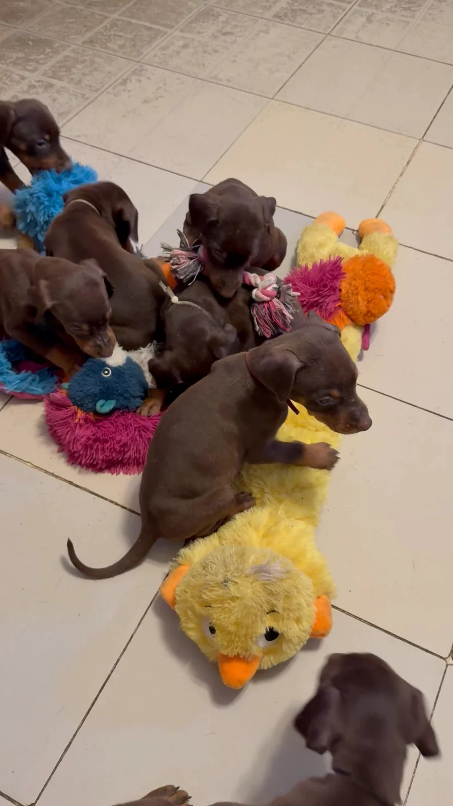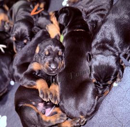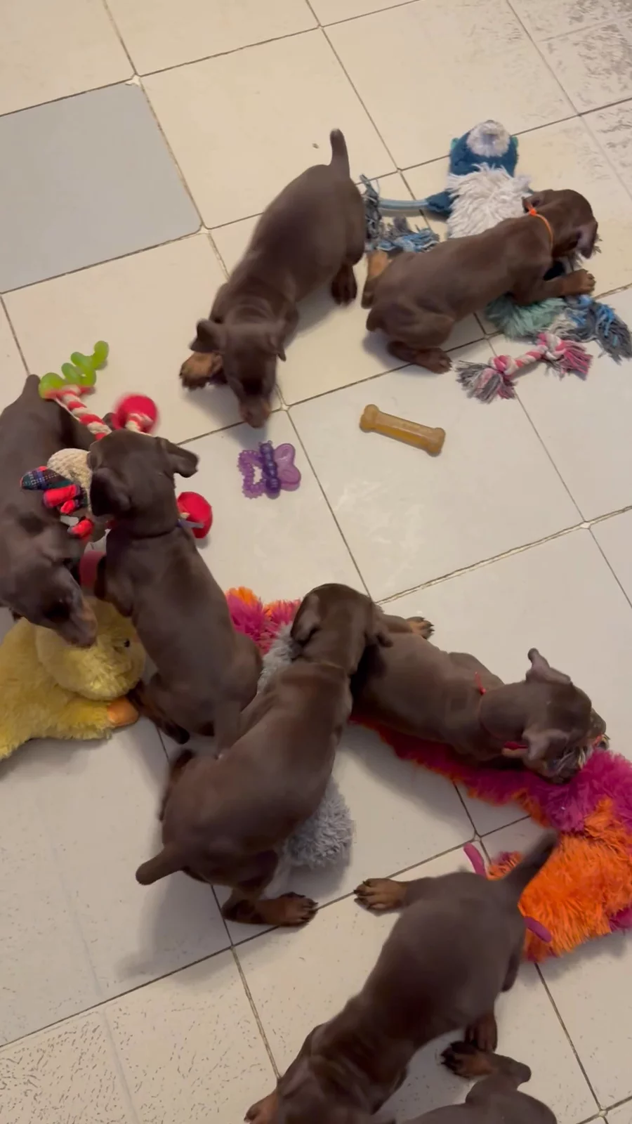Our puppies include black and rust, blue and rust, fawn (isabella) and rust, and red and rust. Colors will vary depending on the parent dogs.