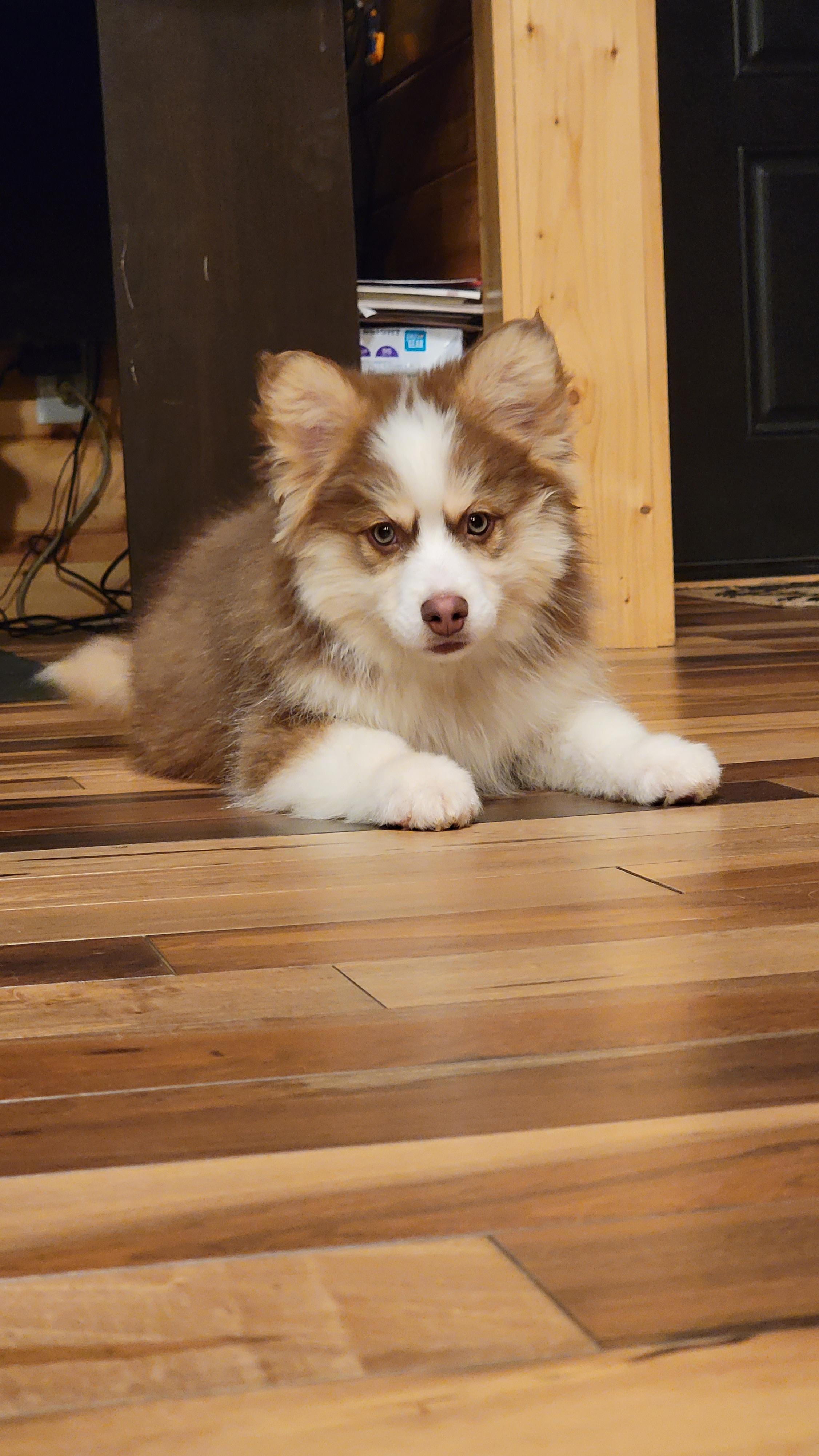 Maikoh is a female Pomsky. Carefully selected as a great representative of her breed, Heather decided to make her part of their program. Heather has passed Good Dog’s screening process, which involved a review of their breeding practices, environment, and the mental and physical health of their dogs.
