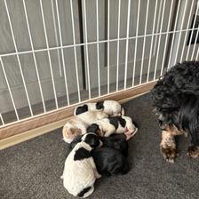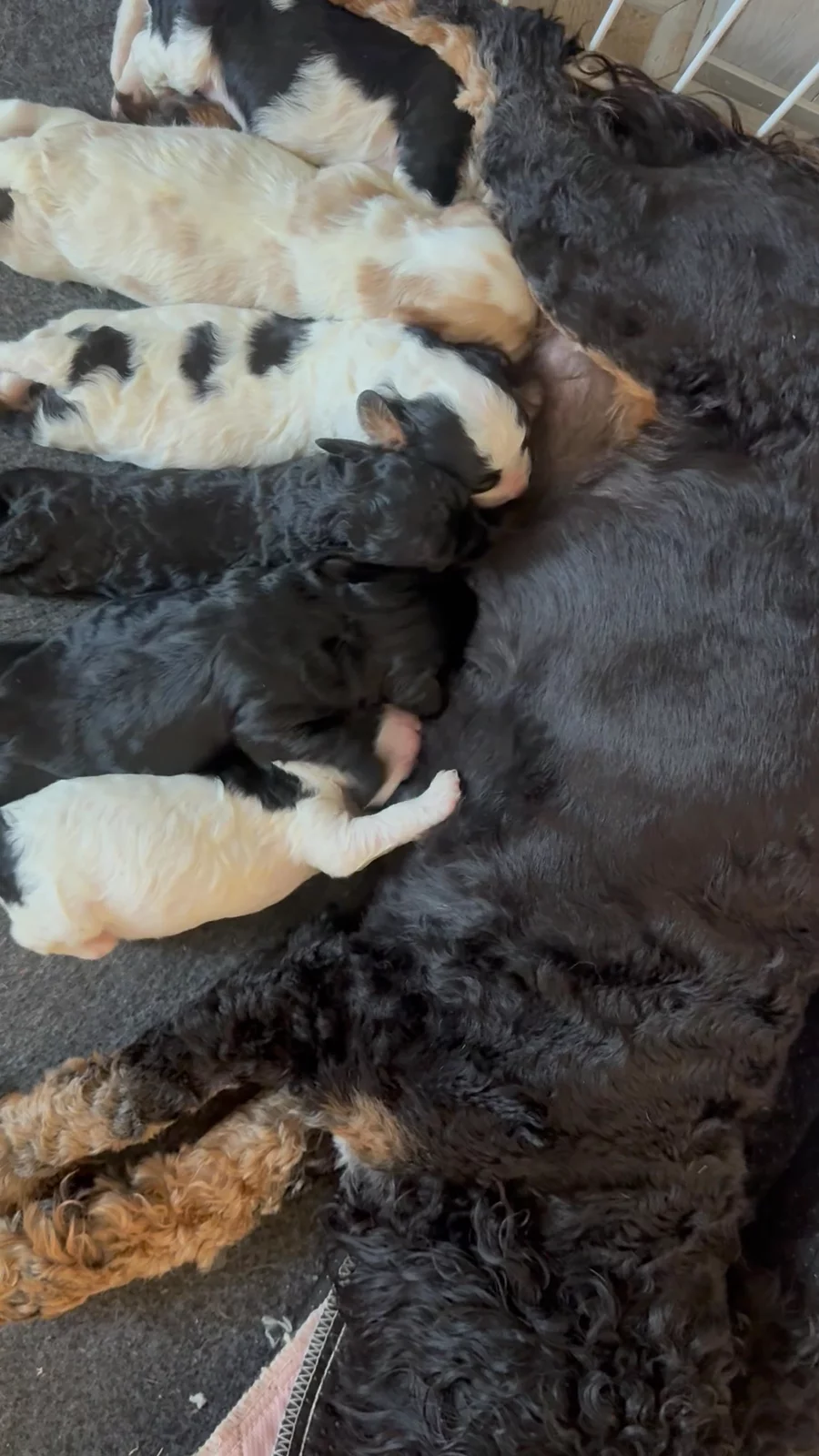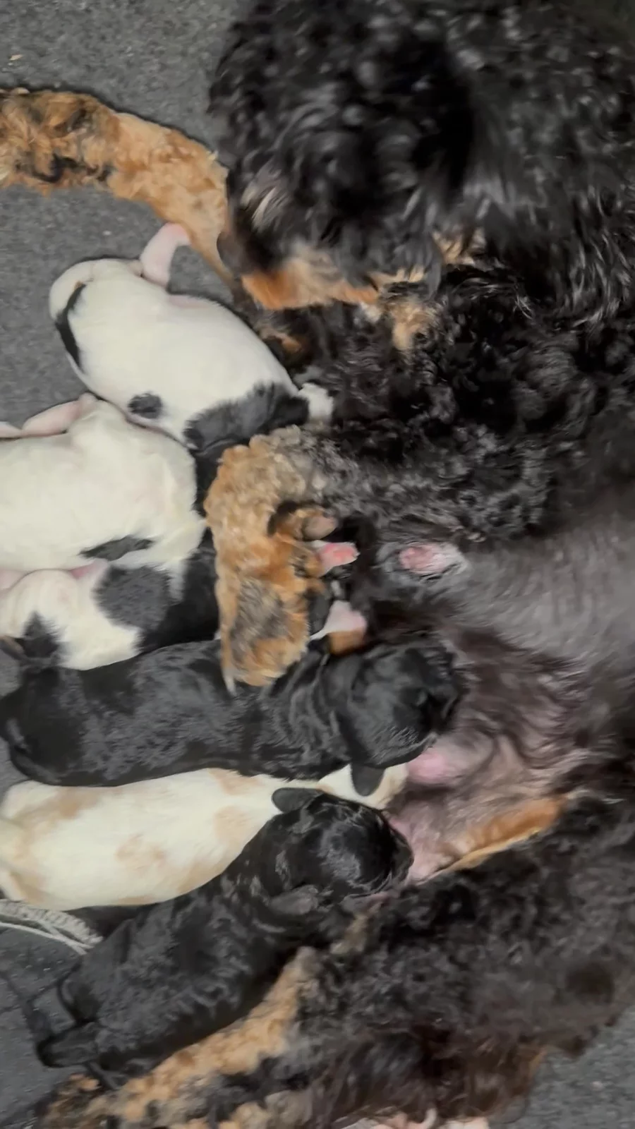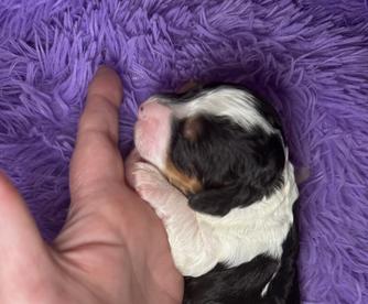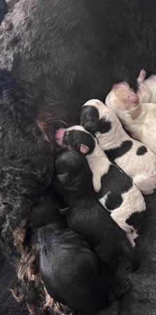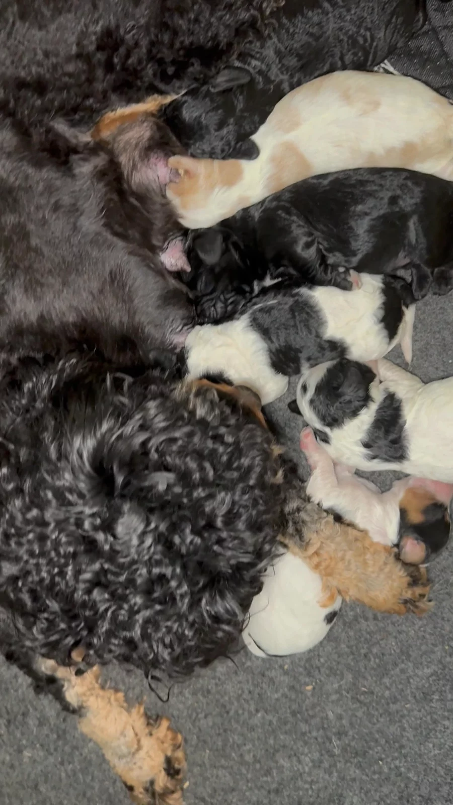 Sweet cavapoo puppies are 9 days old now!! Raven is doing a great job keeping their bellies full! They just had pictures taken today💗