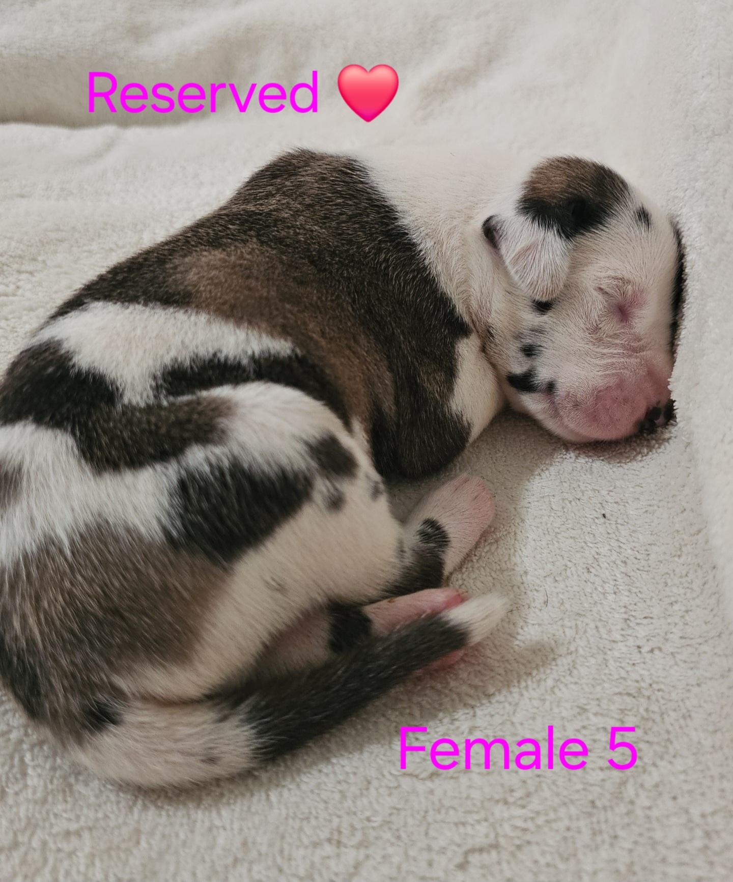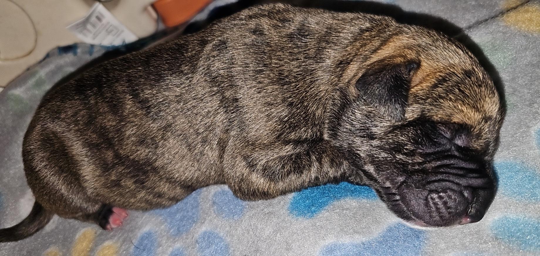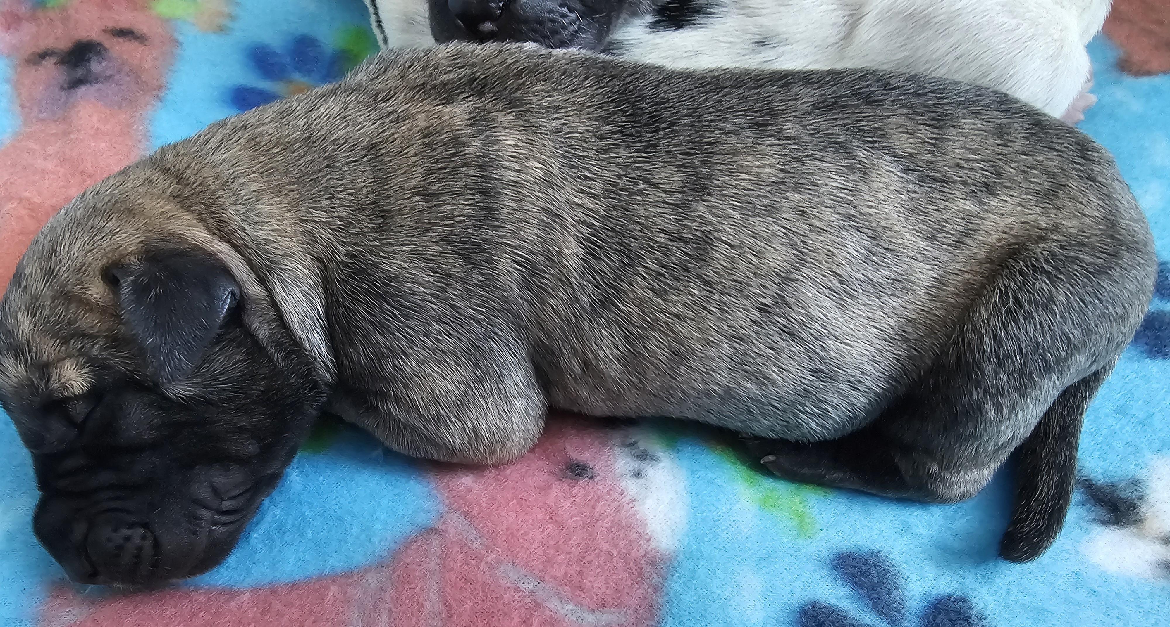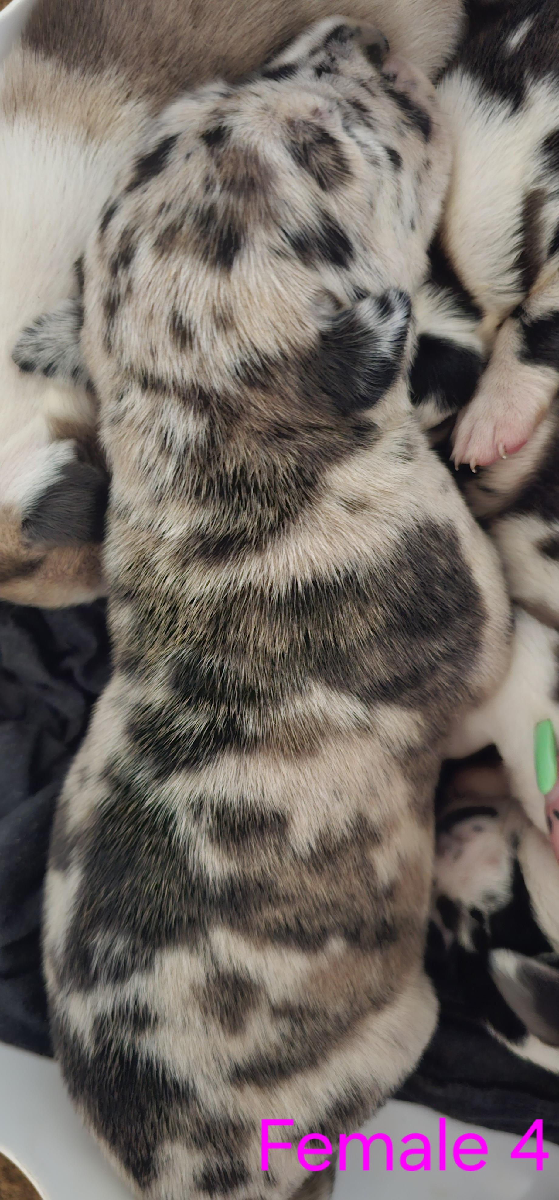 Dulce is a loving, lap dog even though she is way too big for it! She is a mommy pleaser and does anything I tell her to do without me having to say it twice. She is petite in her body structure. Her color is considered brindlequin.