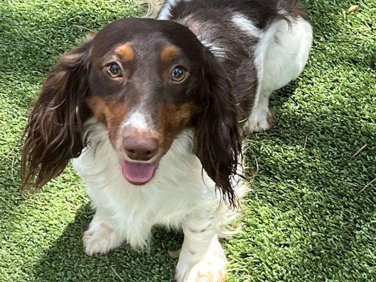 Daiquiri is our AKC registered smooth coat red piebald that carries chocolate & longhair.