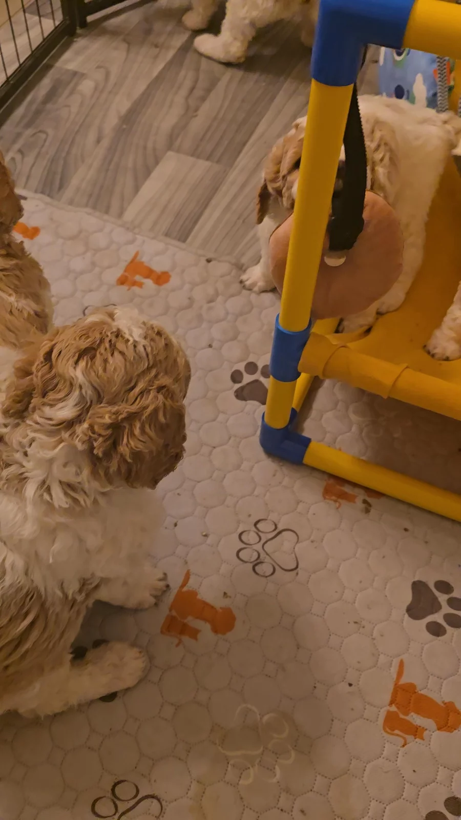 Playing in their small pen this evening and having a great time! They're getting to know the adult dogs and getting more exposure to the hustle and bustle of everyday life around the house 🤗