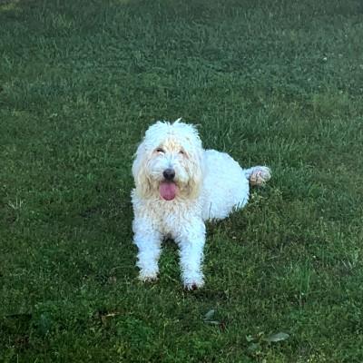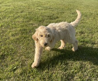 Lucy is a CKC registered white F1b Goldendoodle. She is a smaller Goldendoodle weighing 50 lbs. She is sweet and super loveable!