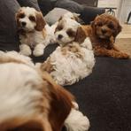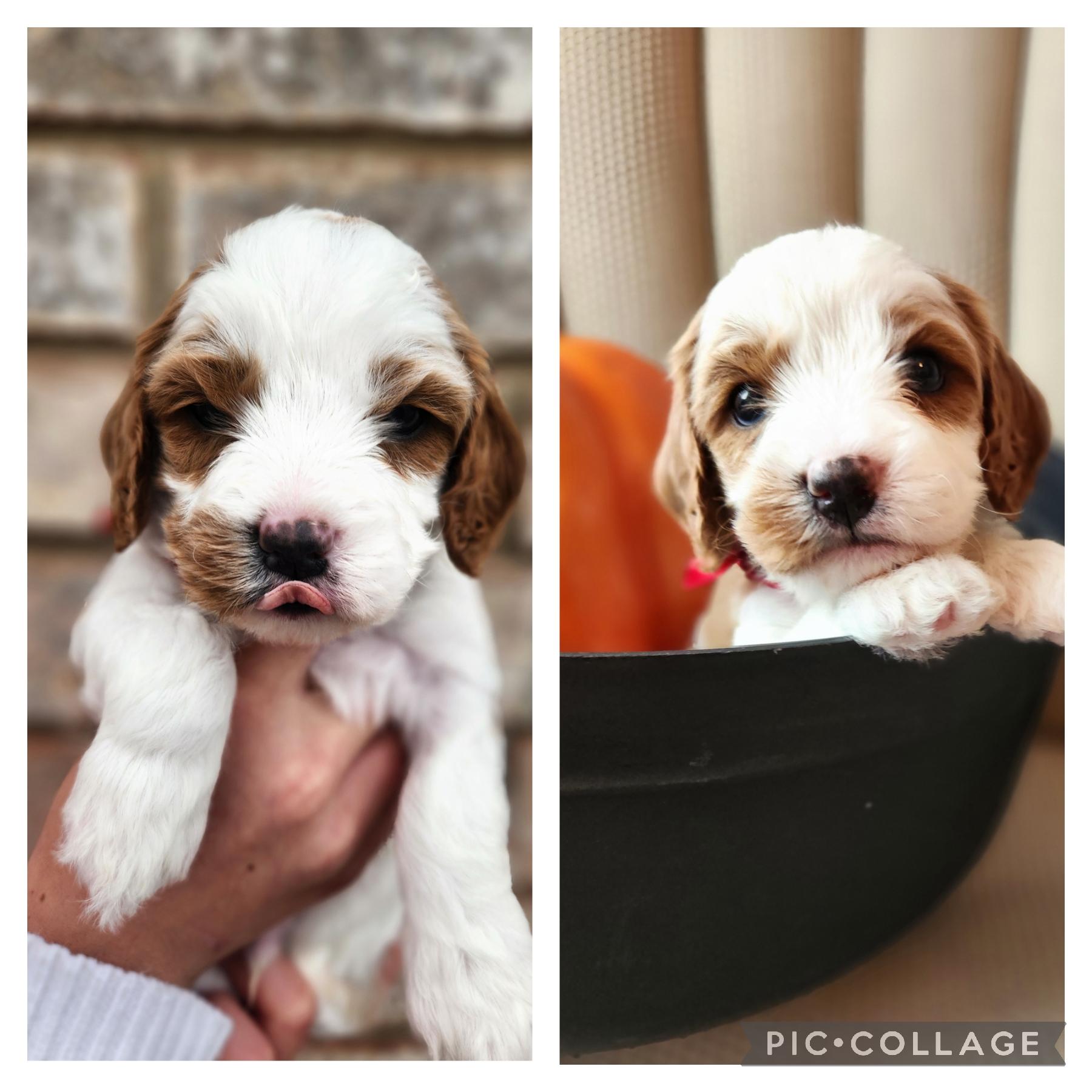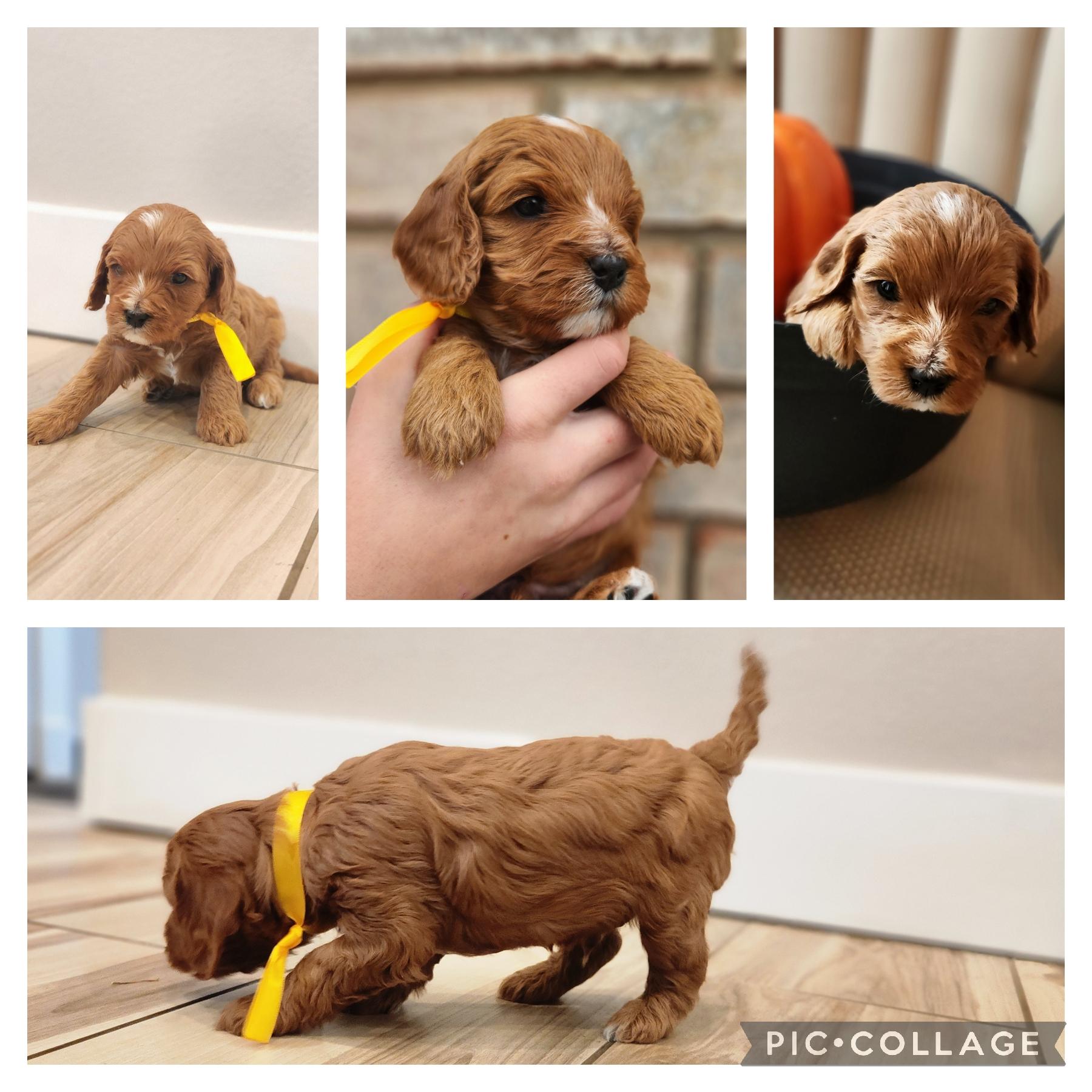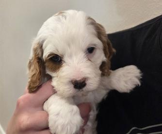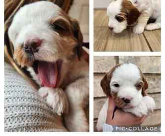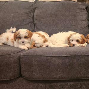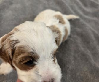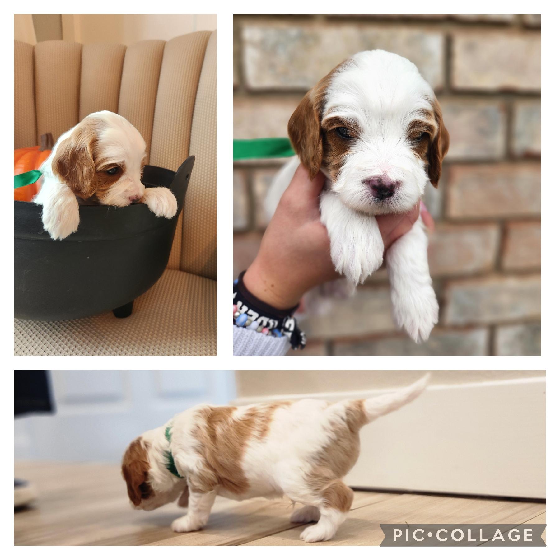 Our Cavalier King Charles Spaniel puppies are blenheim. Cavapoo puppies include red, blenheim, white, and apricot. Colors will vary depending on the parent dogs.