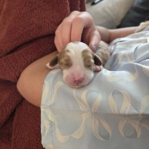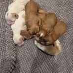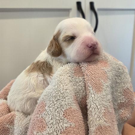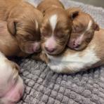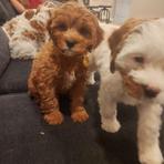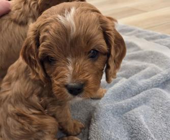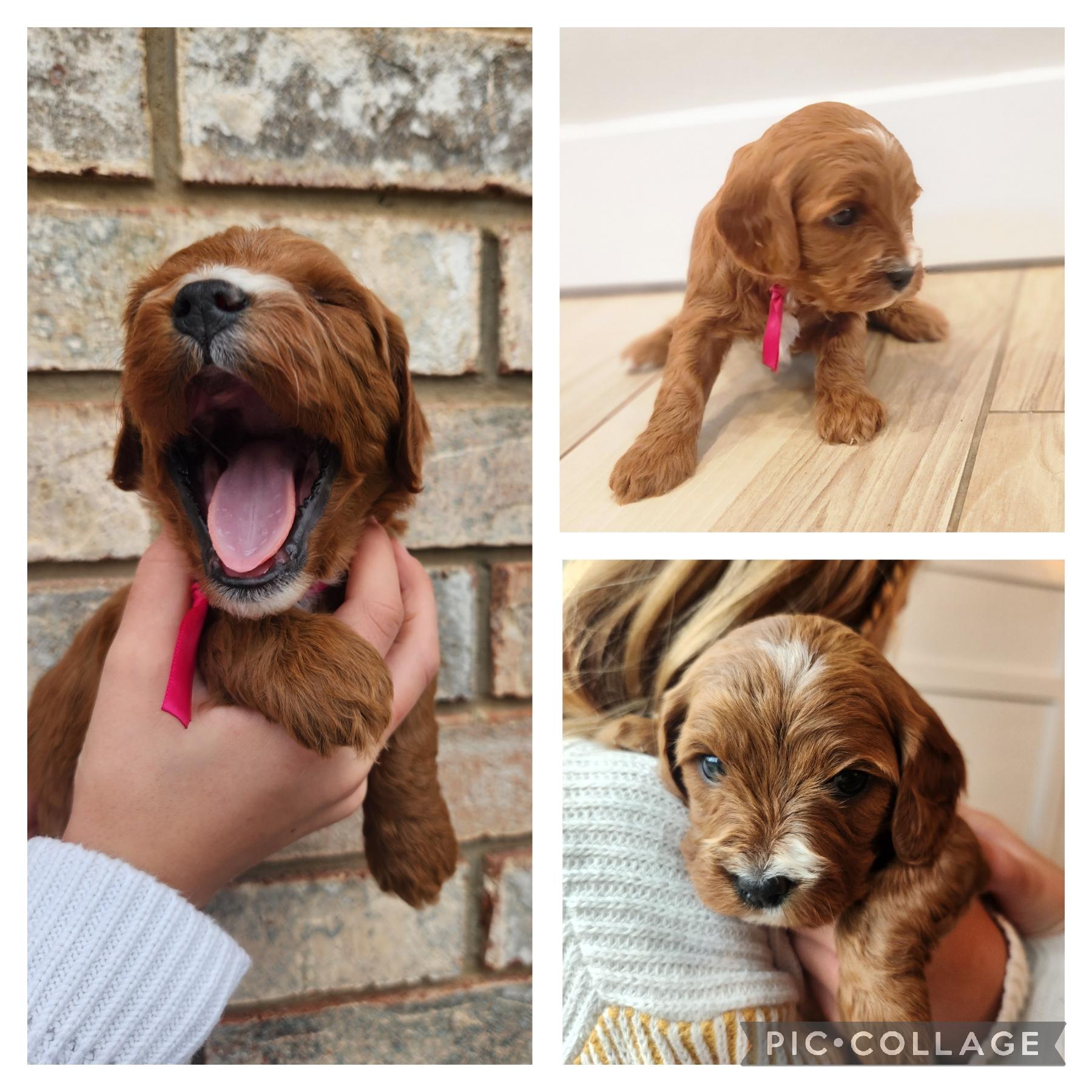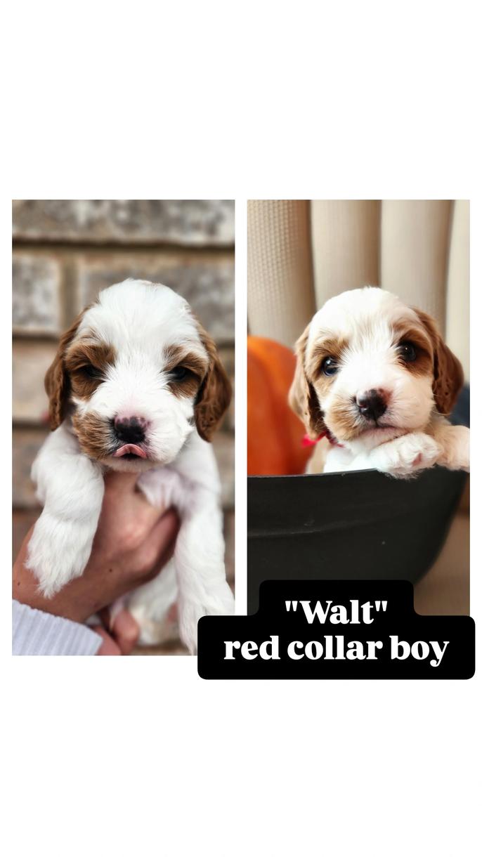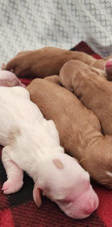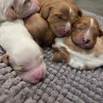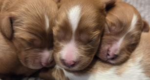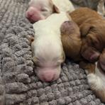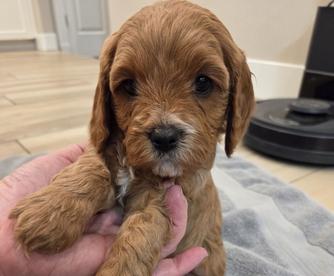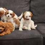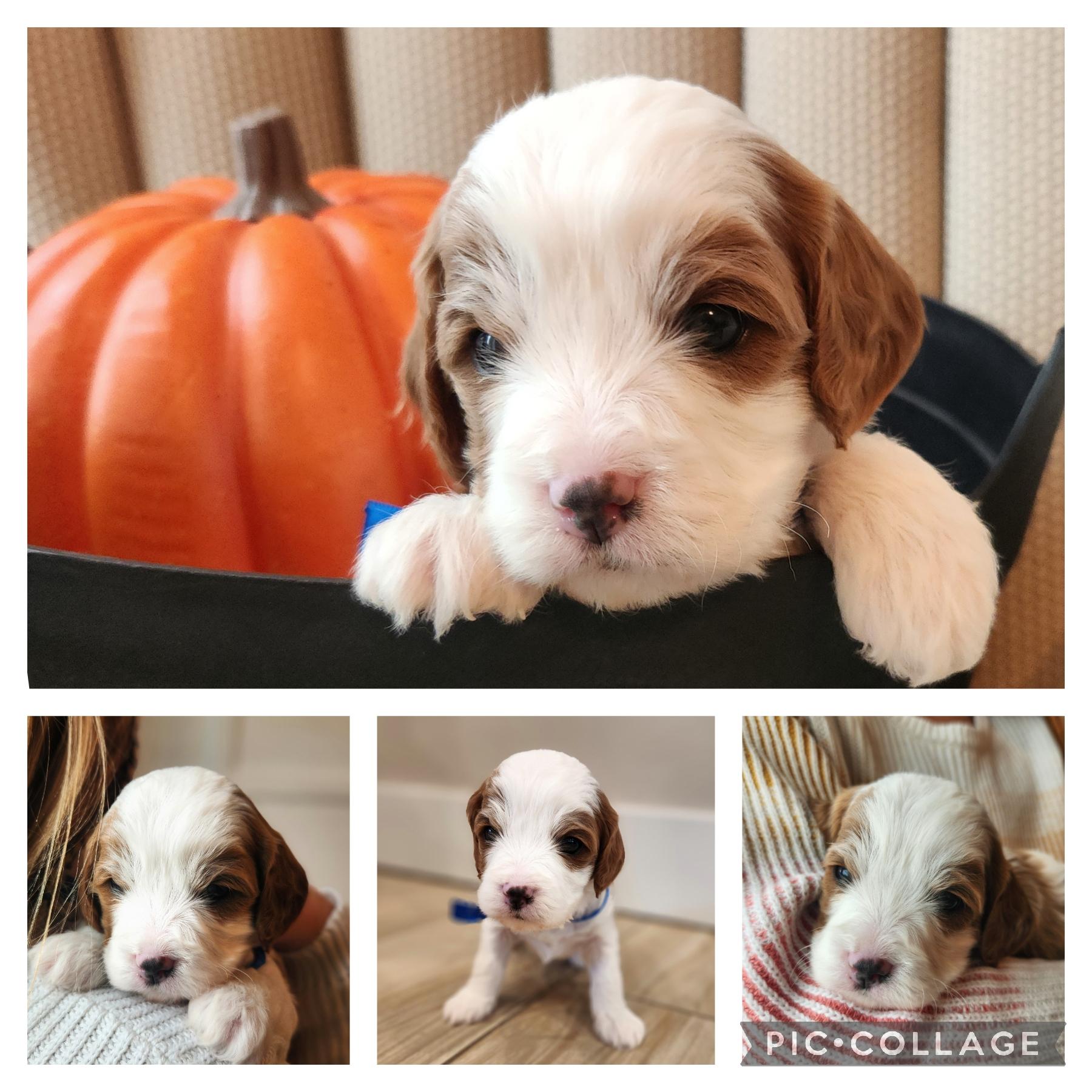 Our Cavalier King Charles Spaniel puppies are blenheim. Cavapoo puppies include red, blenheim, white, and apricot. Colors will vary depending on the parent dogs.