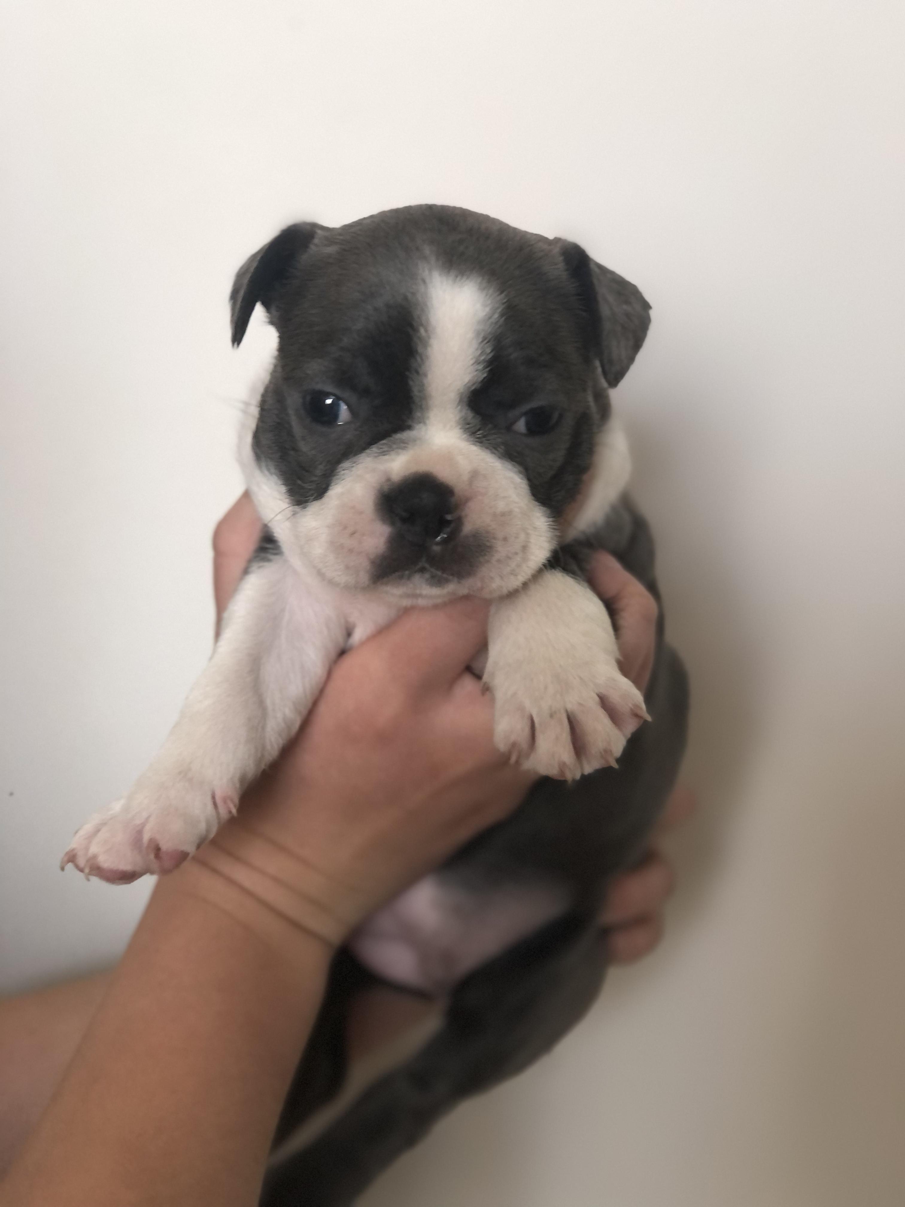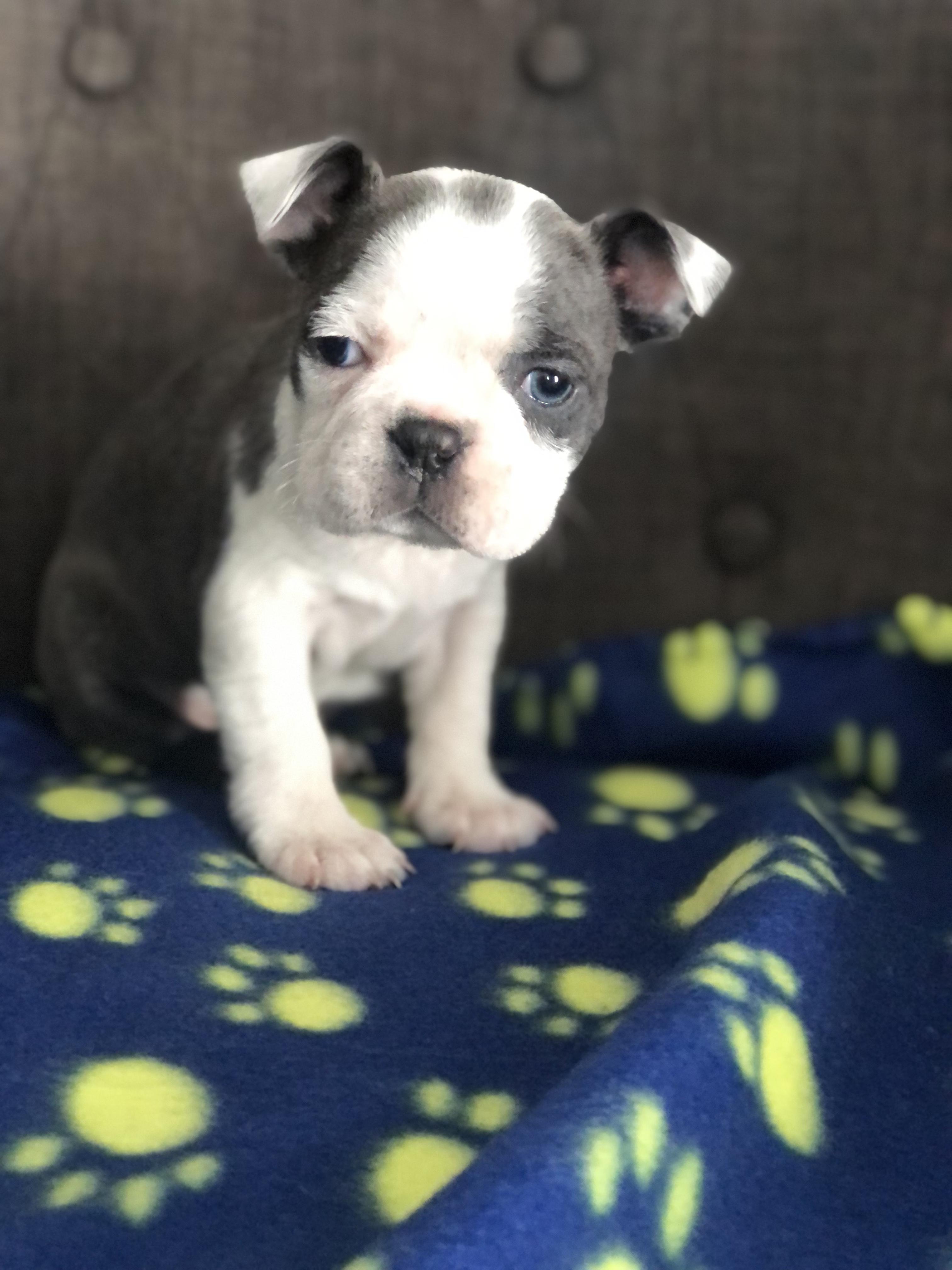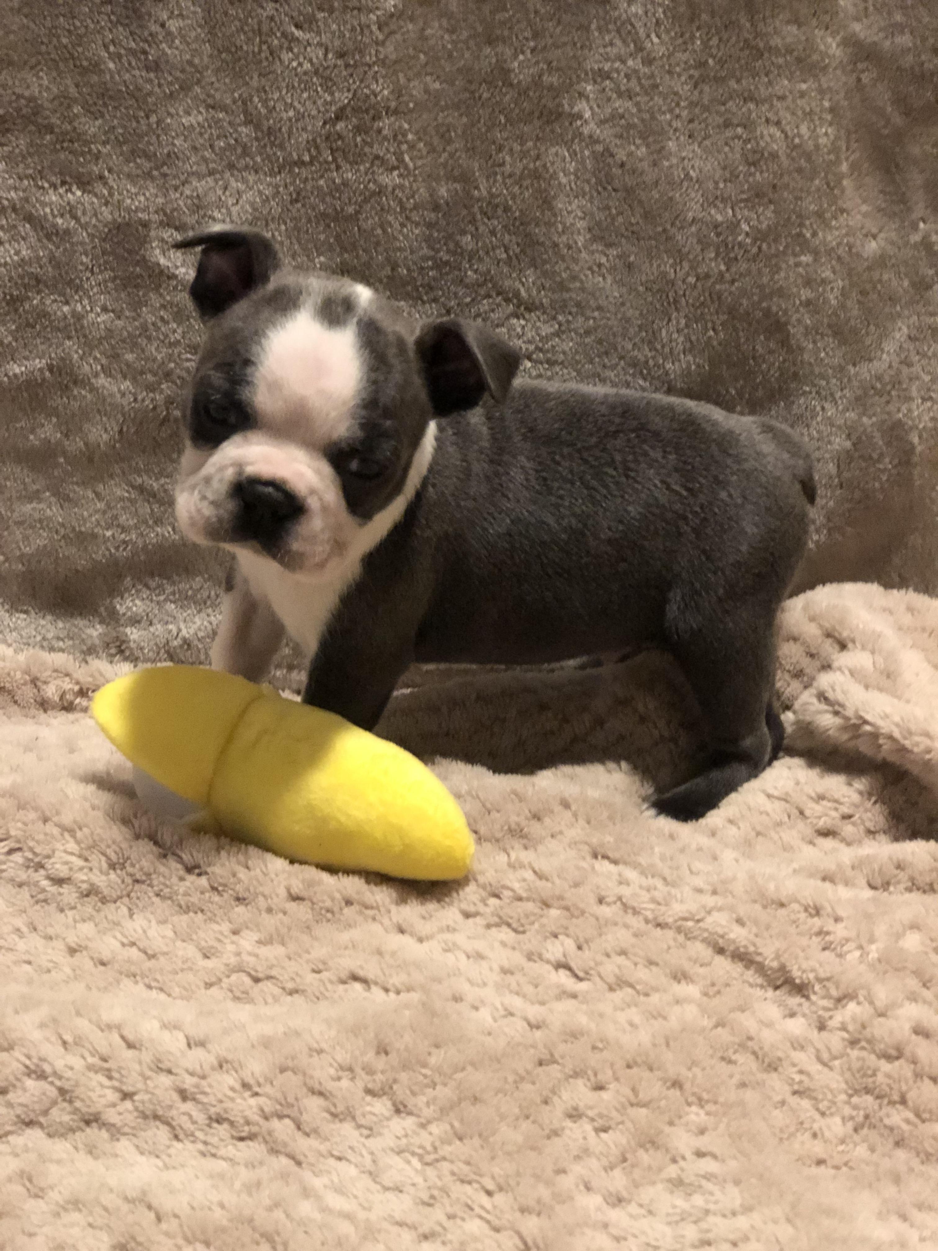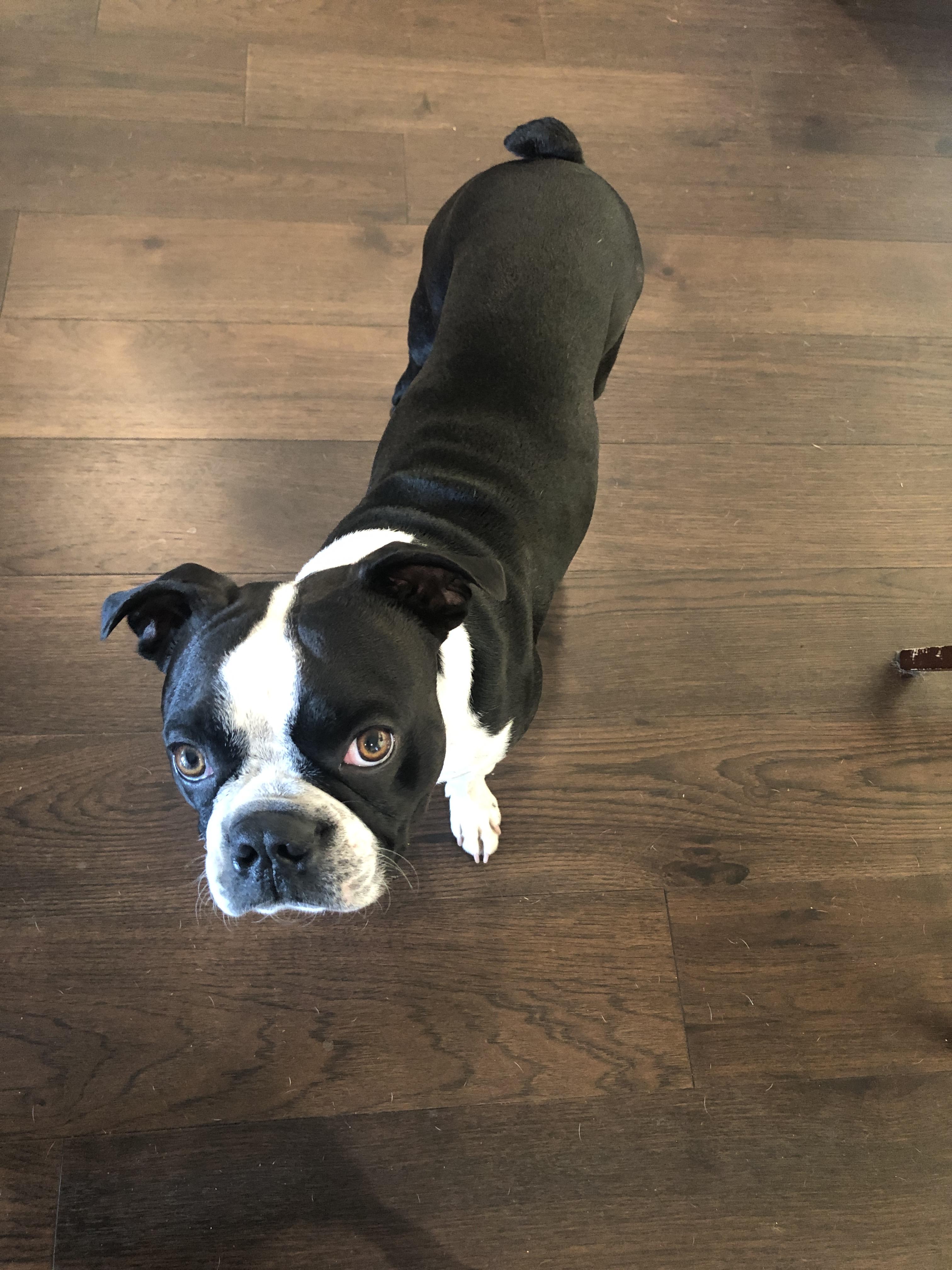 Huey is very playful and energetic. He loves running around in the back yard and racing our older fixed Boston, Dozer. Huey is 26 pounds and 16 inches.