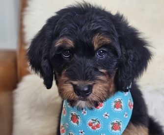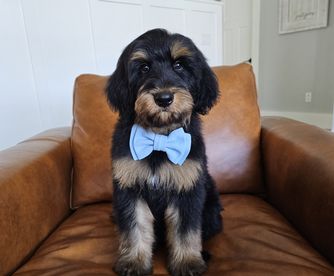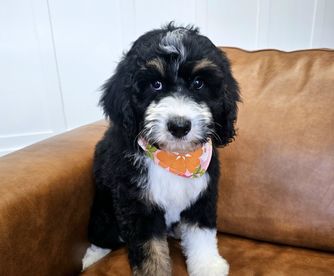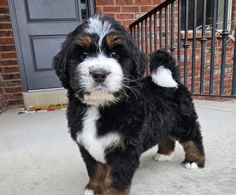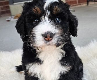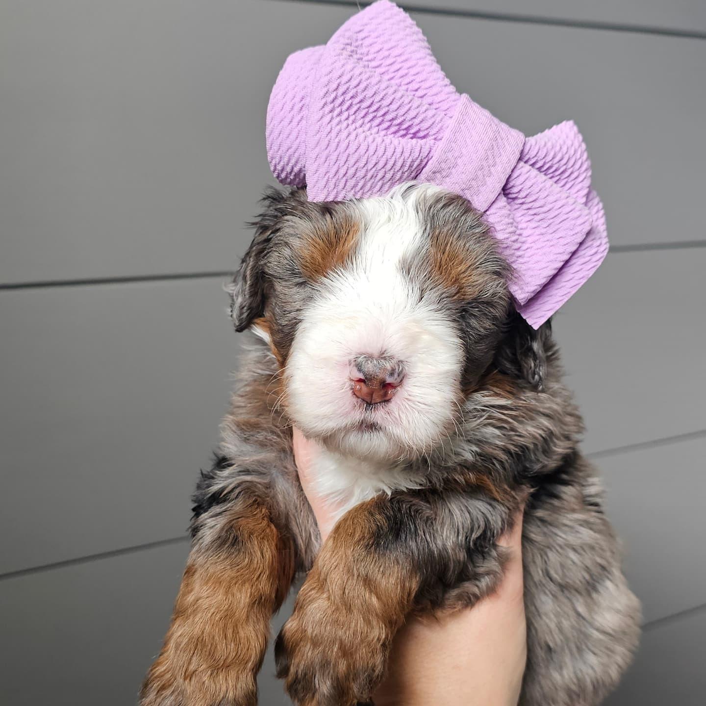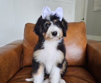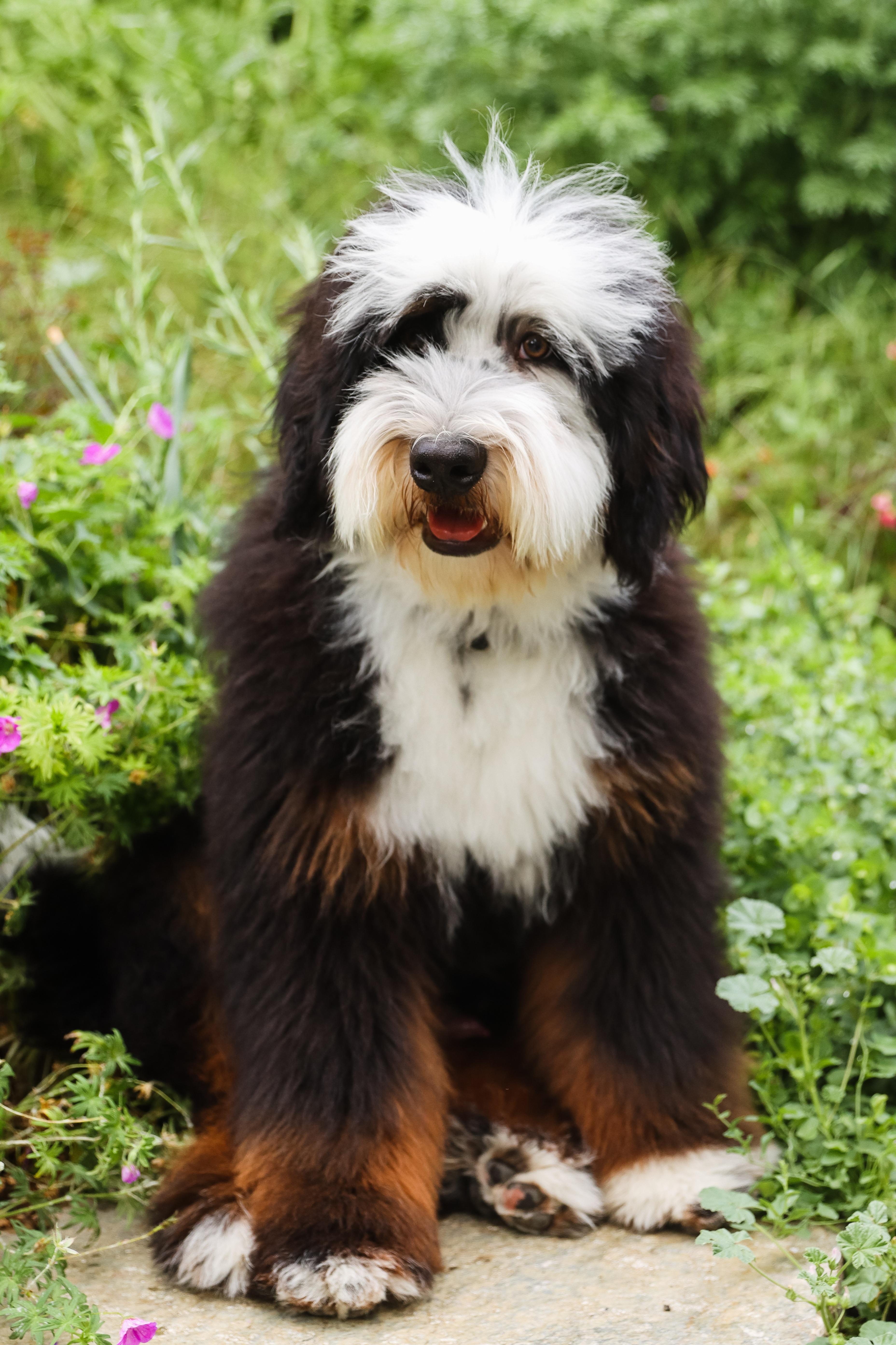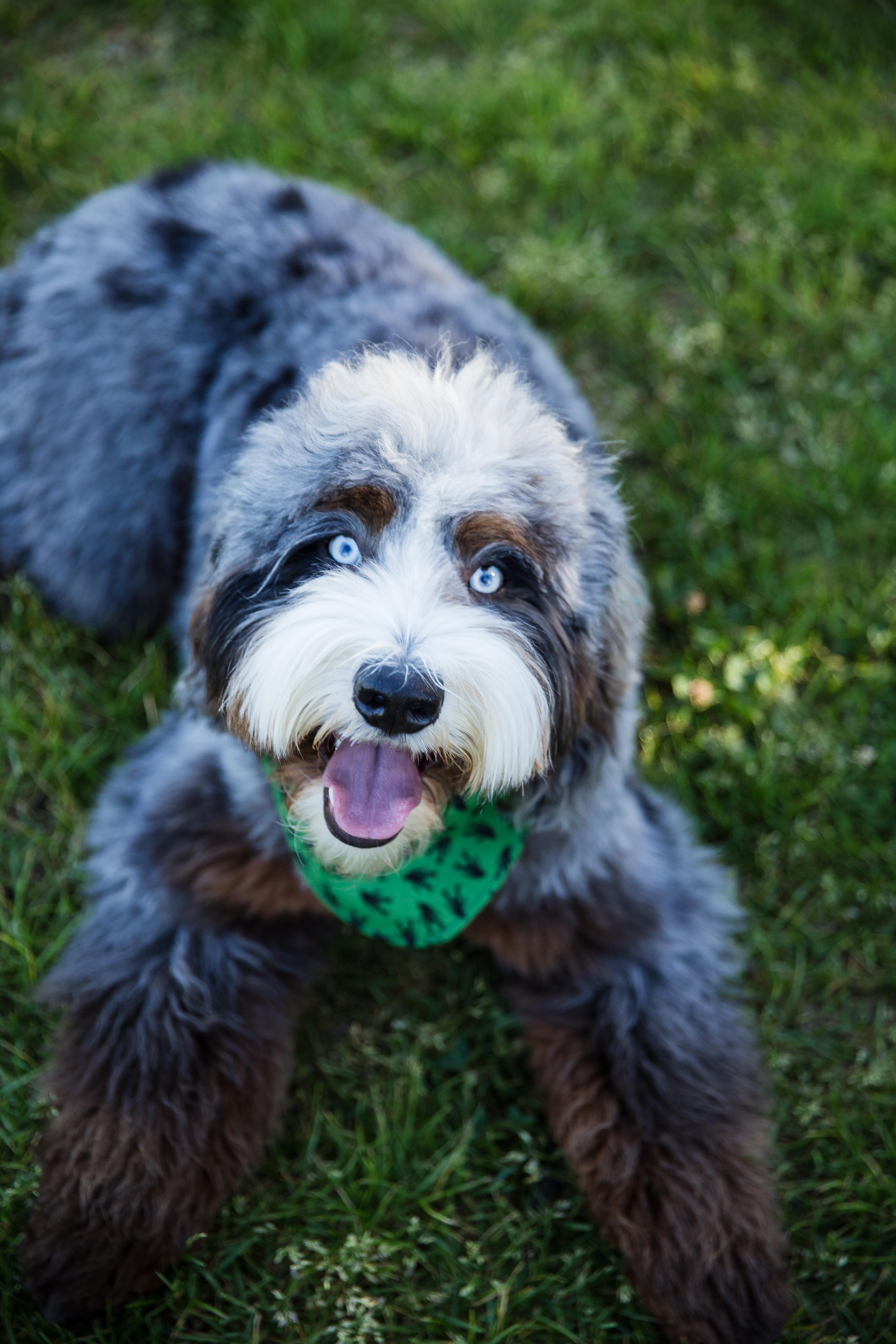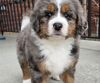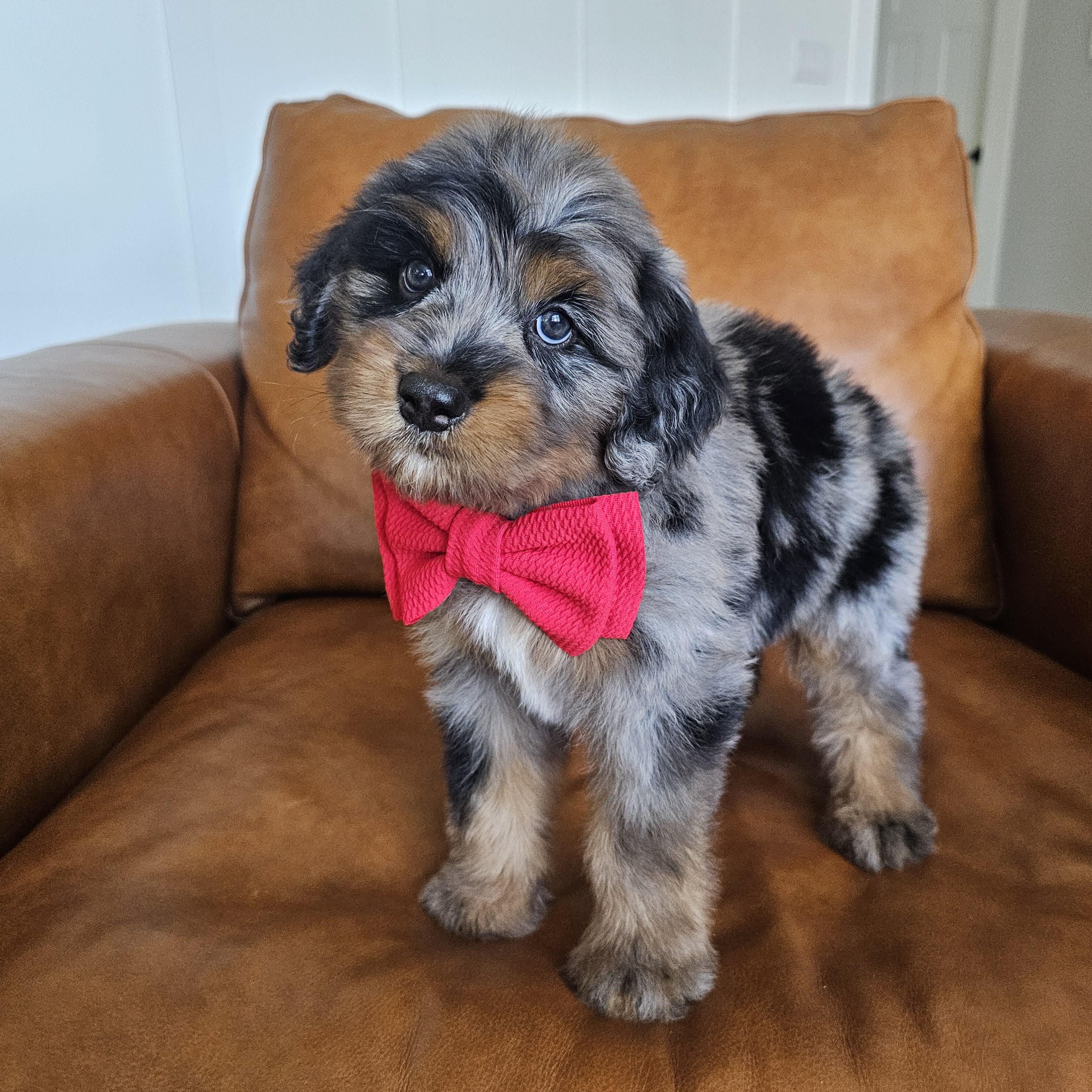 Our Bernedoodle puppies include tri-color and merle. Aussiedoodle puppies include blue merle, red merle, and black tri-color. Colors will vary depending on the parent dogs.