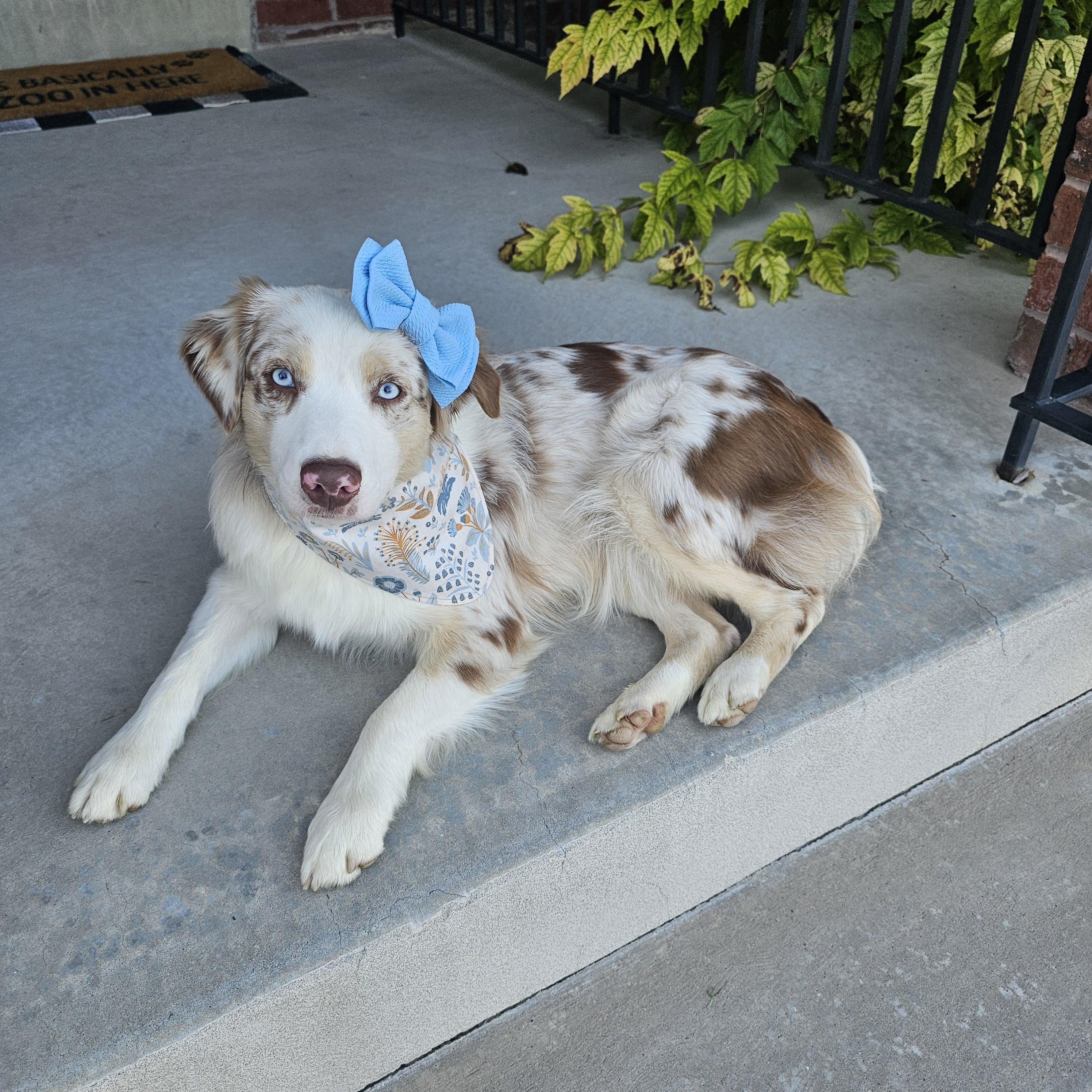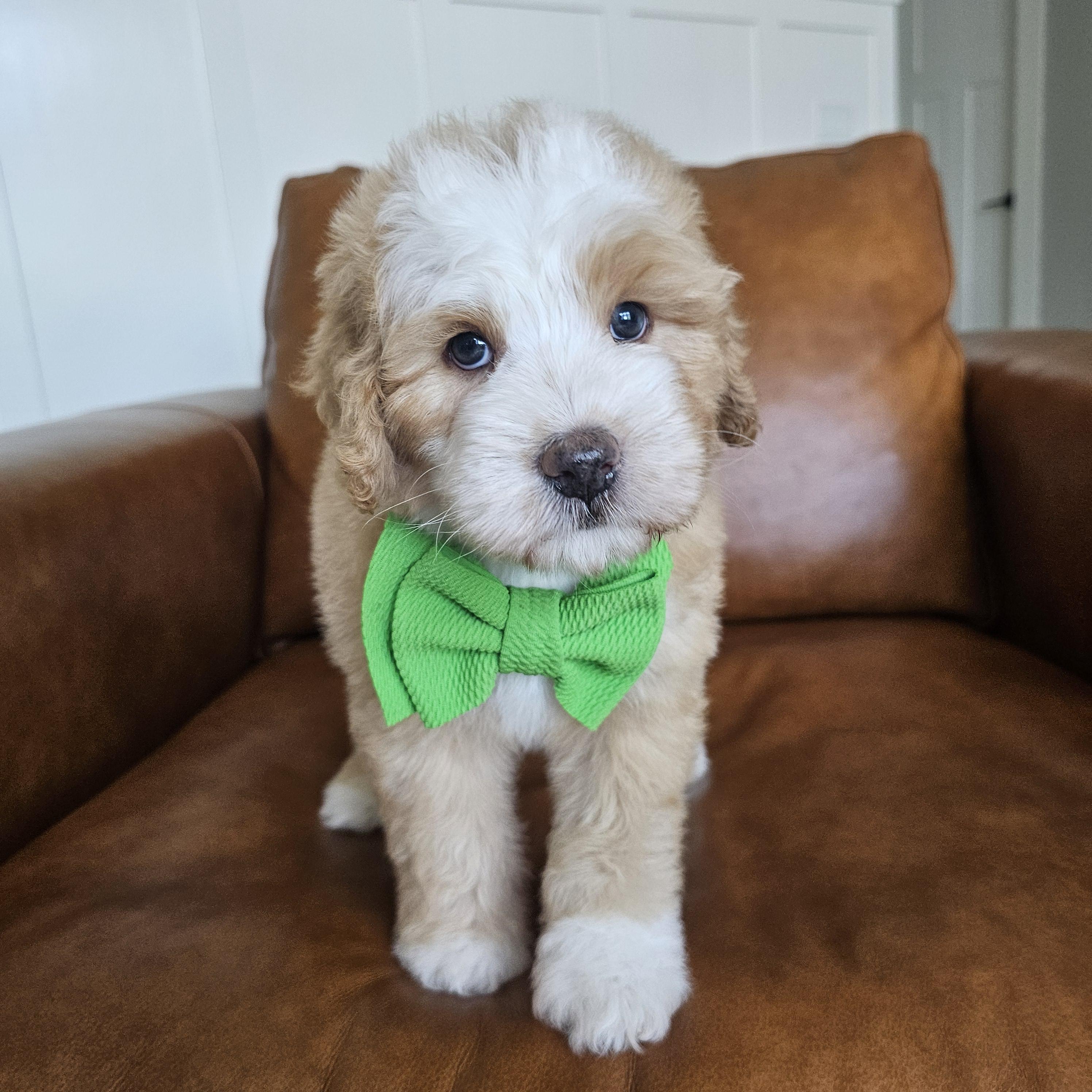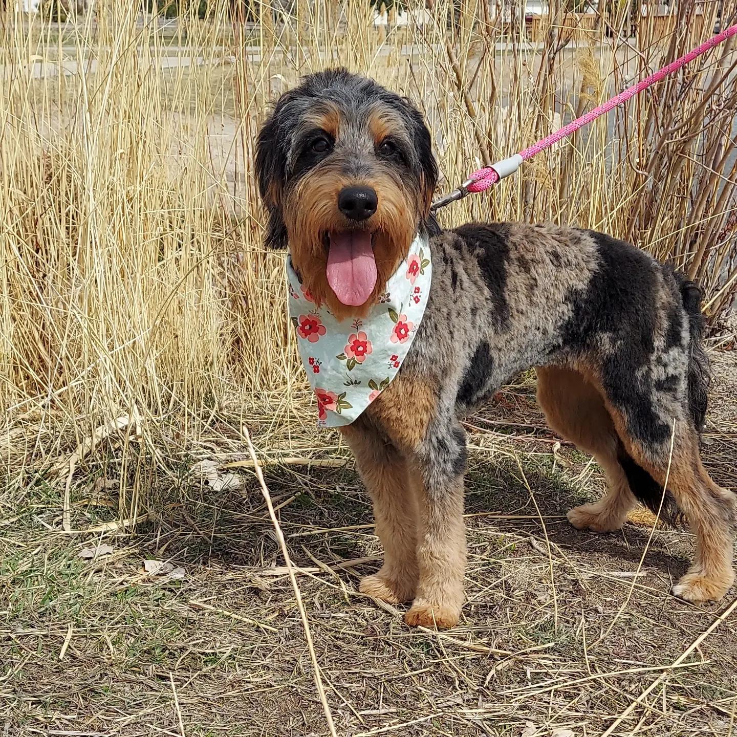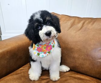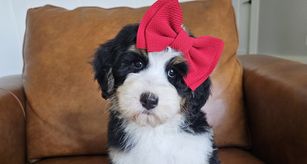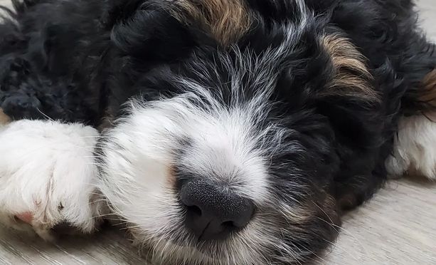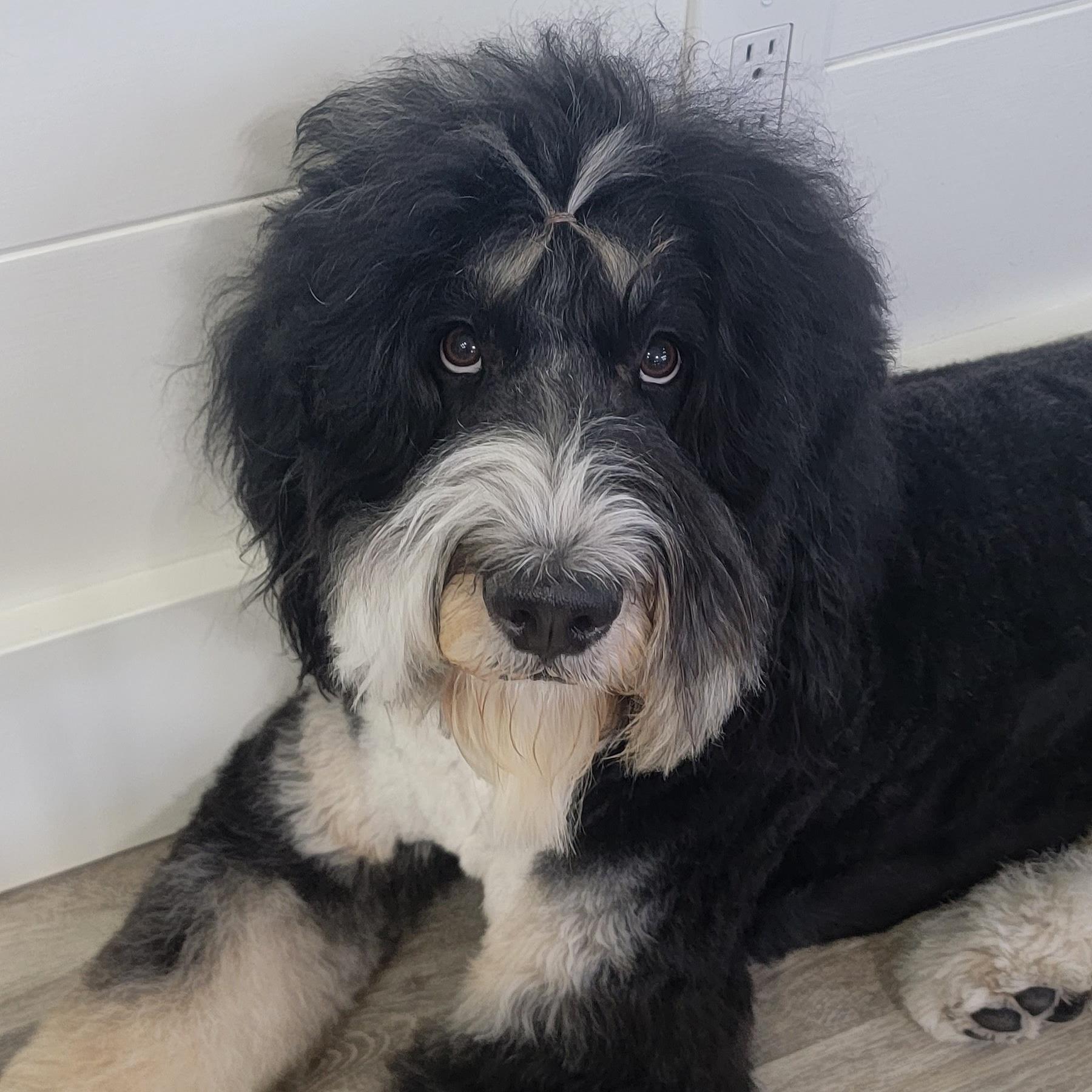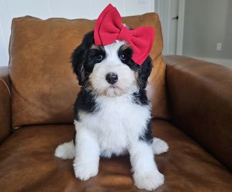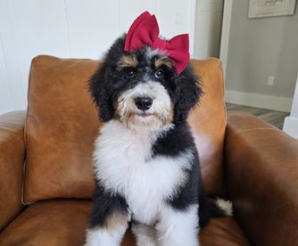 Our Bernedoodle puppies include tri-color and merle. Aussiedoodle puppies include blue merle, red merle, and black tri-color. Colors will vary depending on the parent dogs.