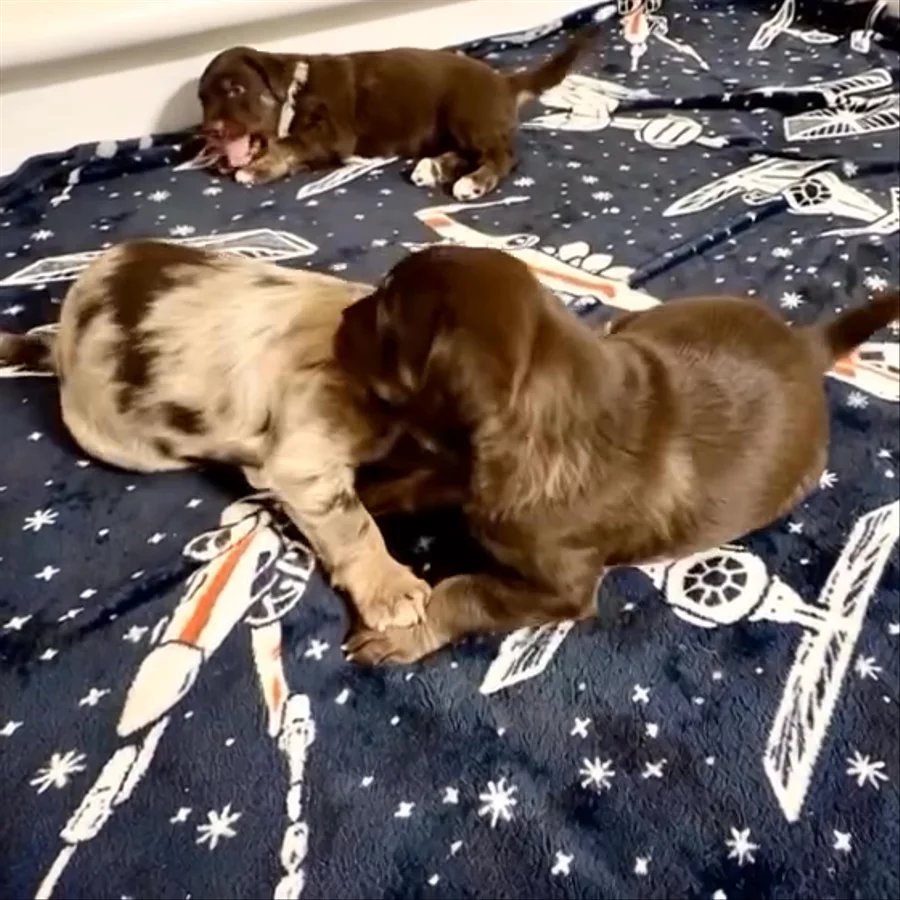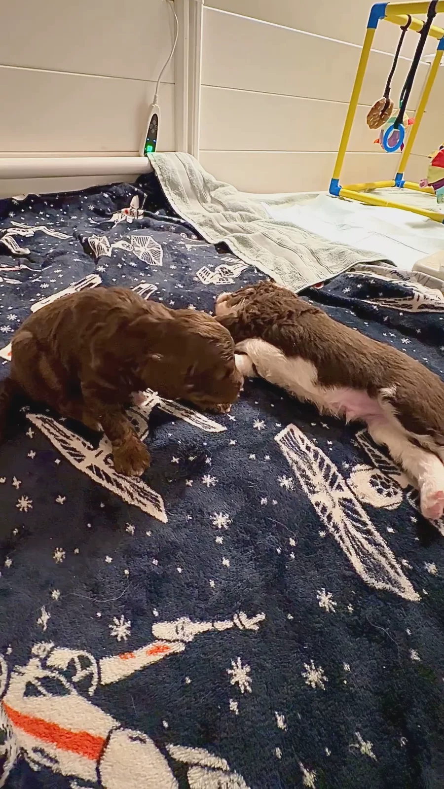 Candid shots of the pups at 3 weeks old - first play fights 🐶🥰