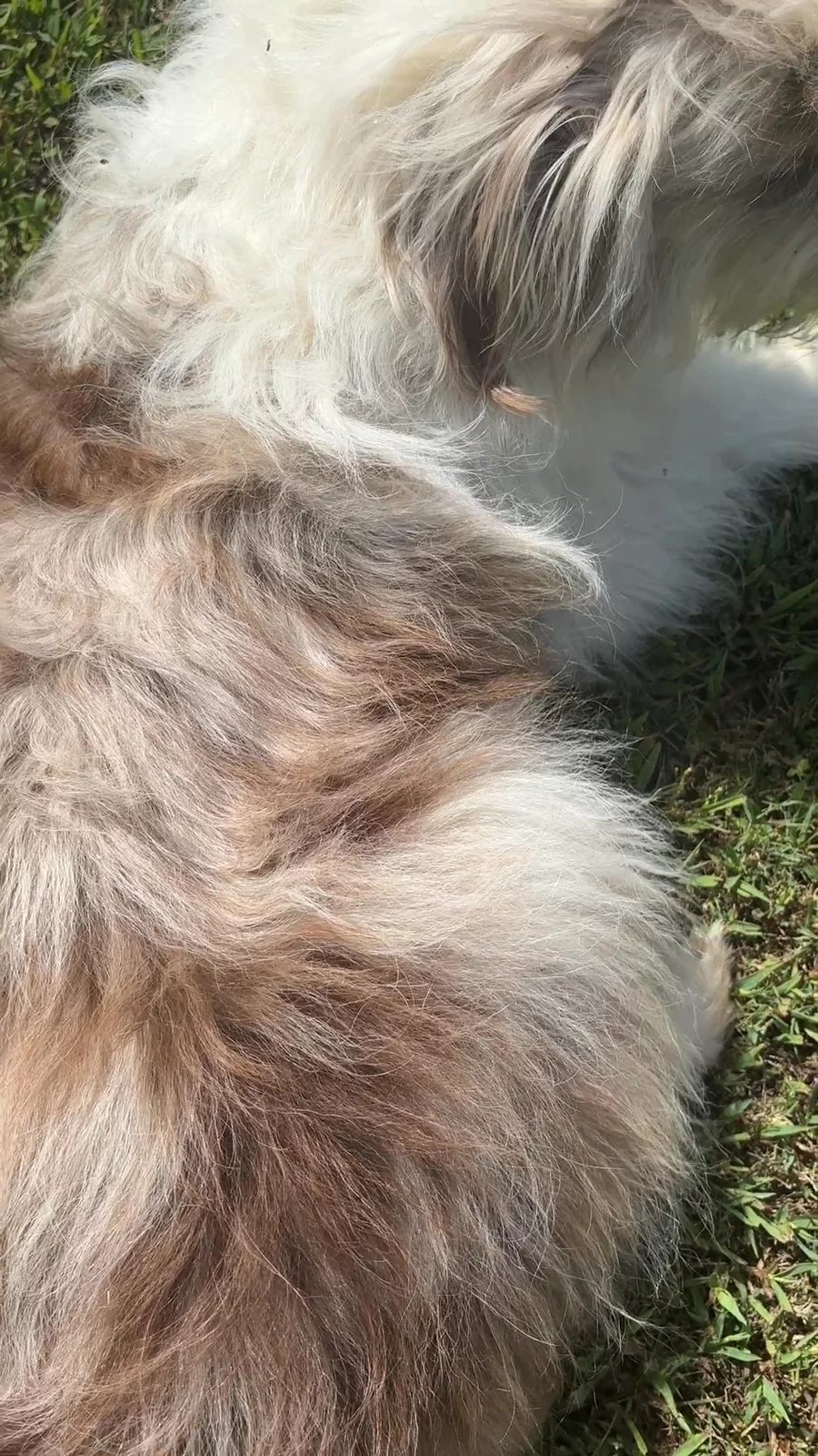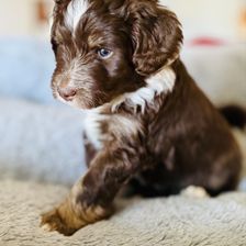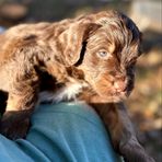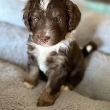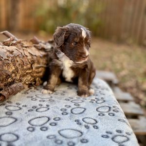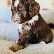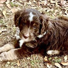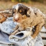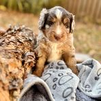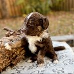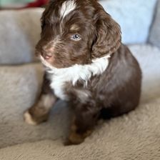Sammi is our beloved F1 4 yr old chocolate merle Aussiedoodle, with slightly wavy no maintenance beautiful coat.