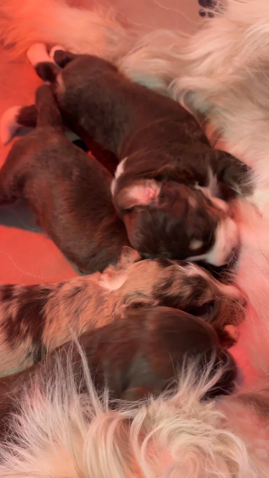 Sammi's country music litter are 15 days old and they are in love with momma's milk bar. Gaining like weeds and starting to walk on all 4s, exploring their surroundings and each other. These pups are getting plenty of love, and gentle handling. ENS every day til day 16. Only Miranda has her eyes open but the rest will follow pretty soon. I will post their lovely faces when that happens 🐶❤️🐶💖 #australianmountaindoodles #puppylove🐶
